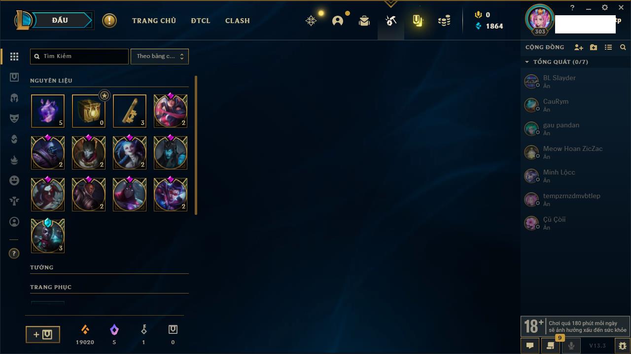 Rank Đơn: Chưa rank mùa nàoKhung: Chưa có khungTướng: 0 - Còn 2000 THXTrang Phục: 0Rank ĐTCL: Chưa RankLinh Thú: 14