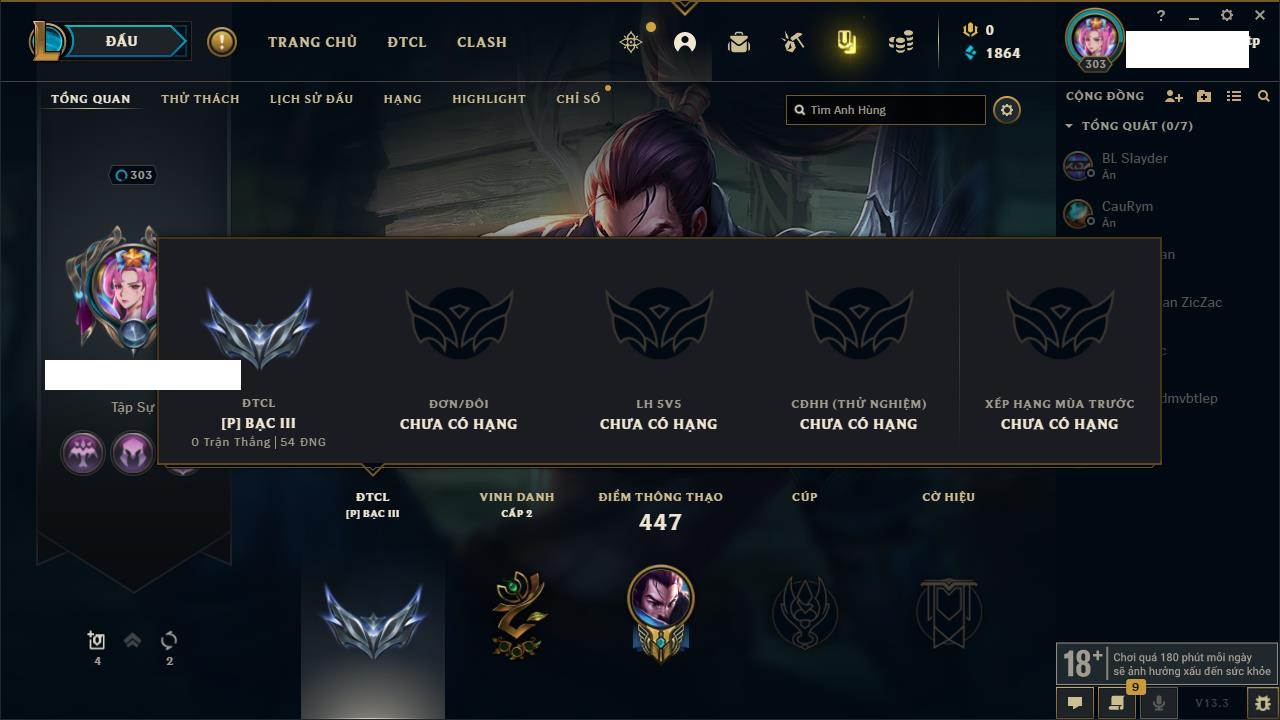 Rank Đơn: Chưa RankKhung: Chưa có khungTướng: 154 - Còn 18477 THXTrang Phục: 127Rank ĐTCL: Vàng ILinh Thú: 183