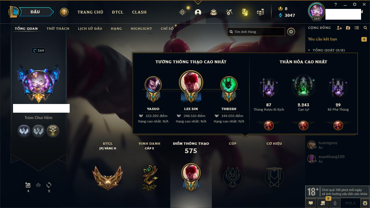 Rank Đơn: Vàng IVKhung: VàngTướng: 170 - Còn 84355 THXTrang Phục: 199Rank ĐTCL: Chưa RankLinh Thú: 116