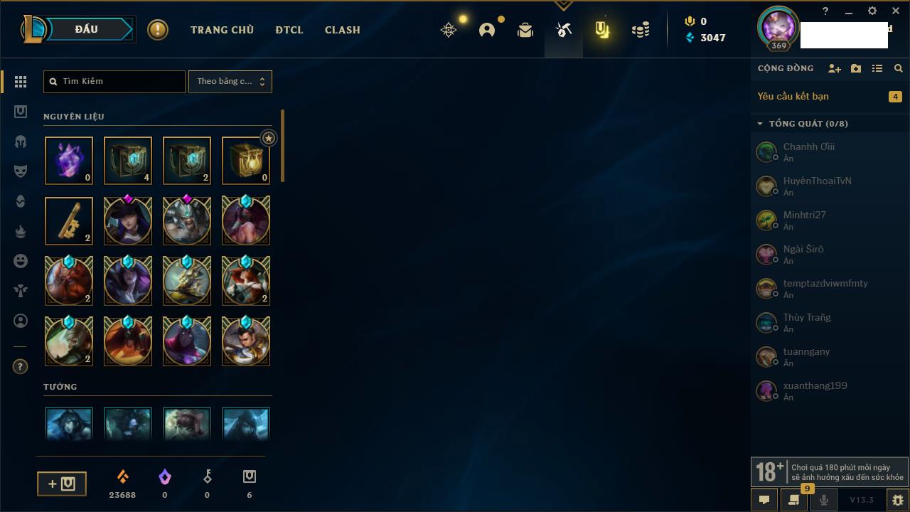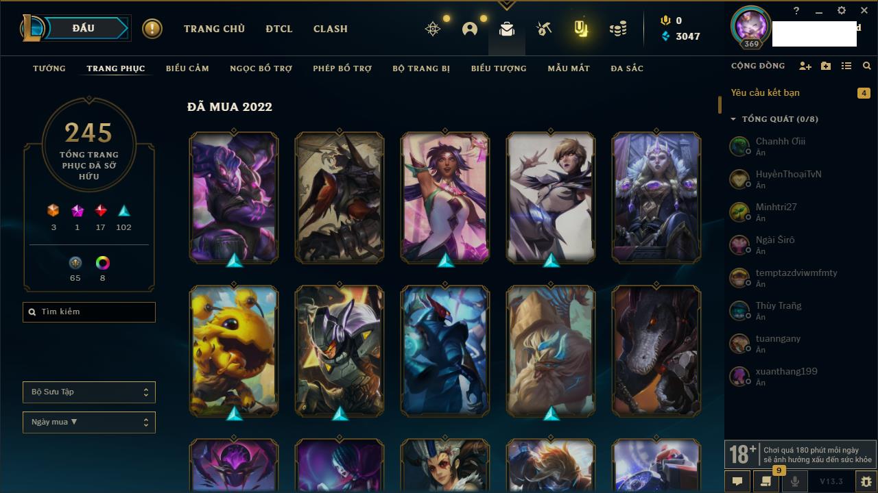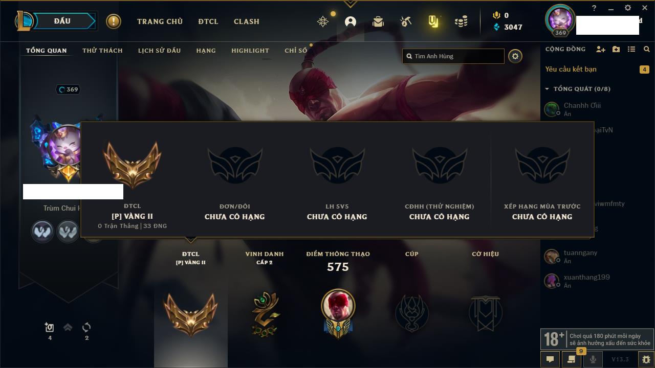 Rank Đơn: Bạc IIIKhung: BạcTướng: 171 - Còn 51045 THXTrang Phục: 220Rank ĐTCL: Sắt IILinh Thú: 141