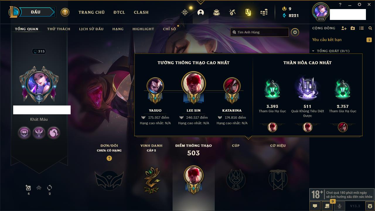 Rank Đơn: Chưa RankKhung: BạcTướng: 141 - Còn 299 THXTrang Phục: 101Rank ĐTCL: Chưa RankLinh Thú: 84
