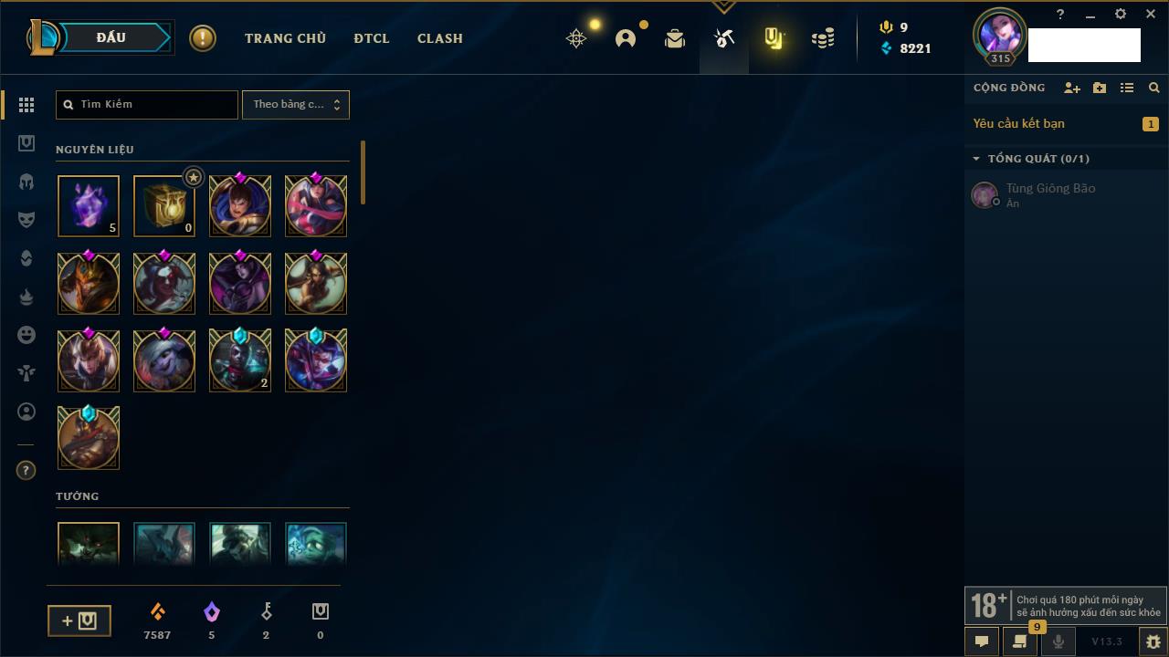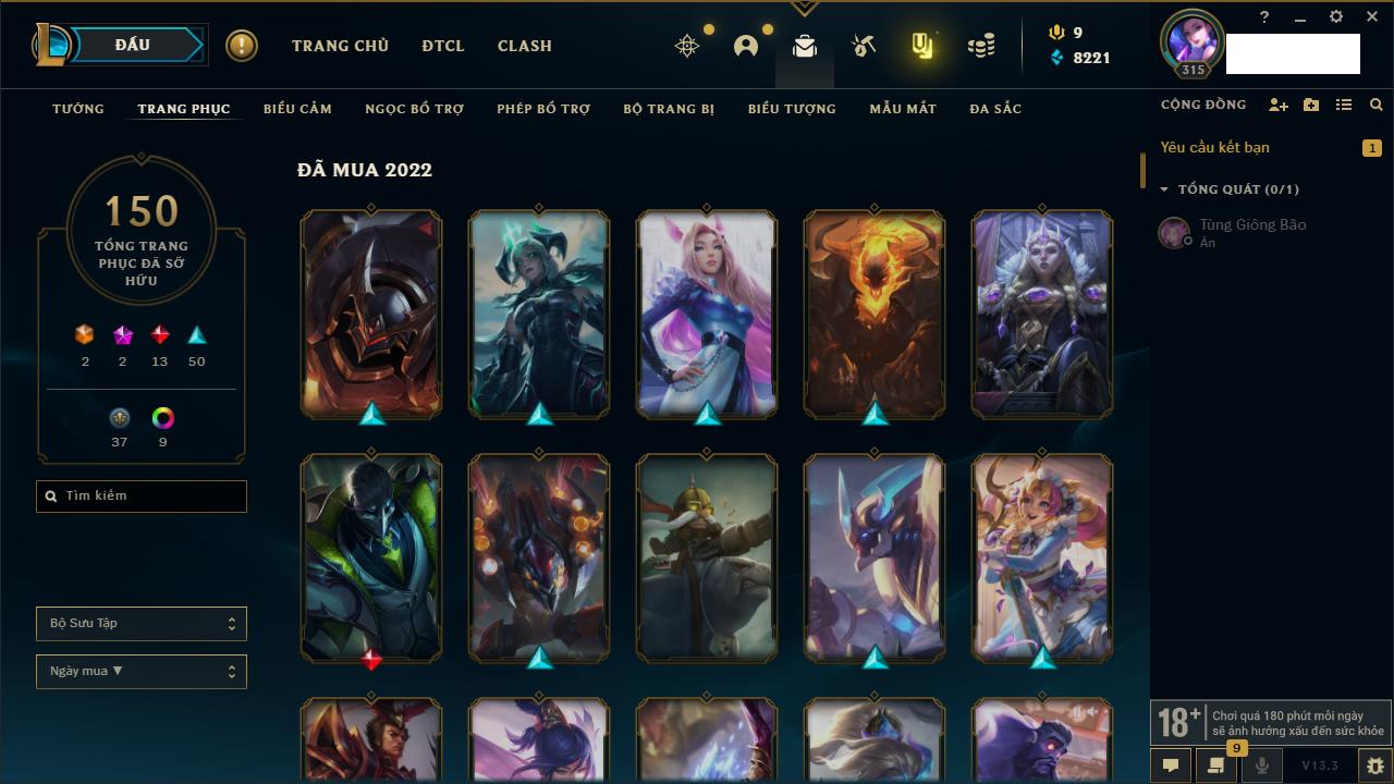 Rank Đơn: Chưa RankKhung: Chưa có khungTướng: 154 - Còn 18477 THXTrang Phục: 127Rank ĐTCL: Vàng ILinh Thú: 183