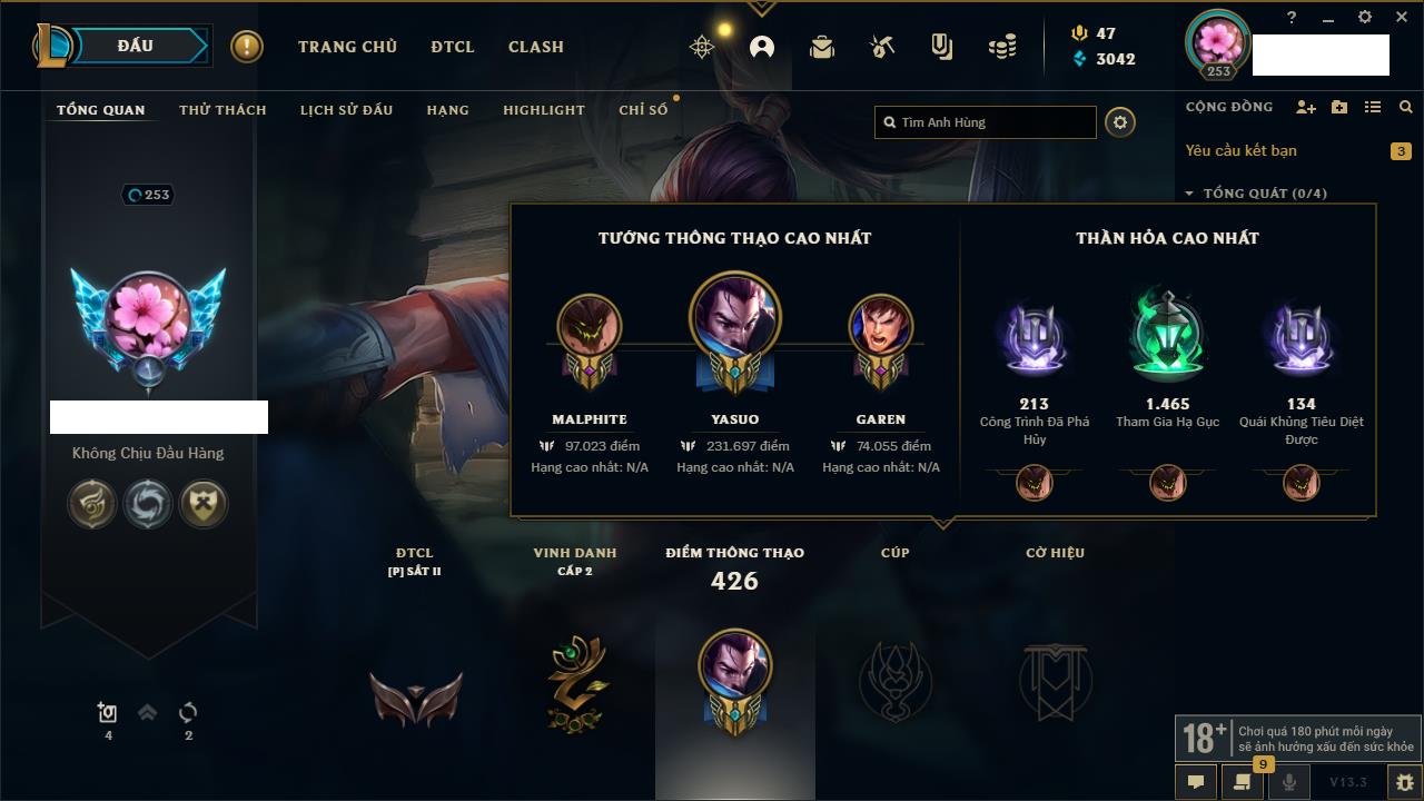 Rank Đơn: Chưa RankKhung: Chưa có khungTướng: 170 - Còn 140067 THXTrang Phục: 165Rank ĐTCL: Chưa RankLinh Thú: 51