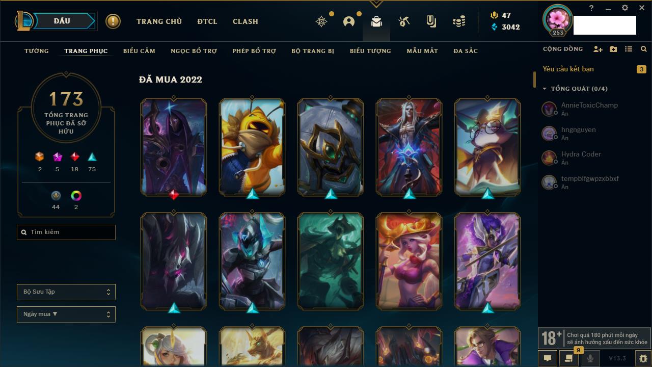 Rank Đơn: Chưa RankKhung: Chưa có khungTướng: 172 - Còn 32072 THXTrang Phục: 195Rank ĐTCL: Chưa RankLinh Thú: 55