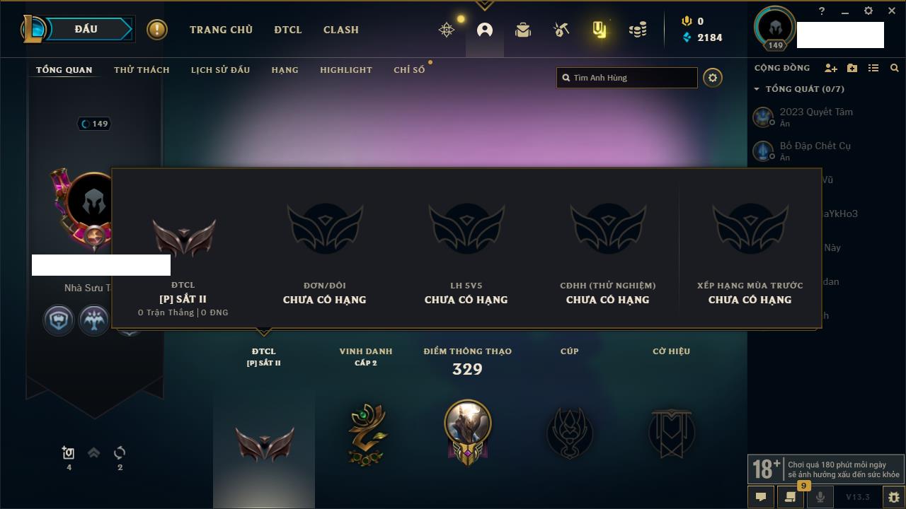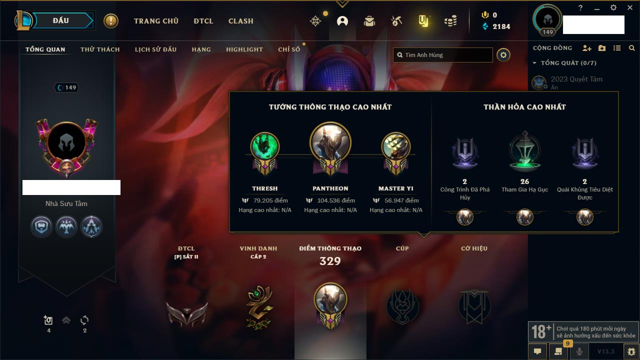 Rank Đơn: Chưa RankKhung: BạcTướng: 141 - Còn 299 THXTrang Phục: 101Rank ĐTCL: Chưa RankLinh Thú: 84