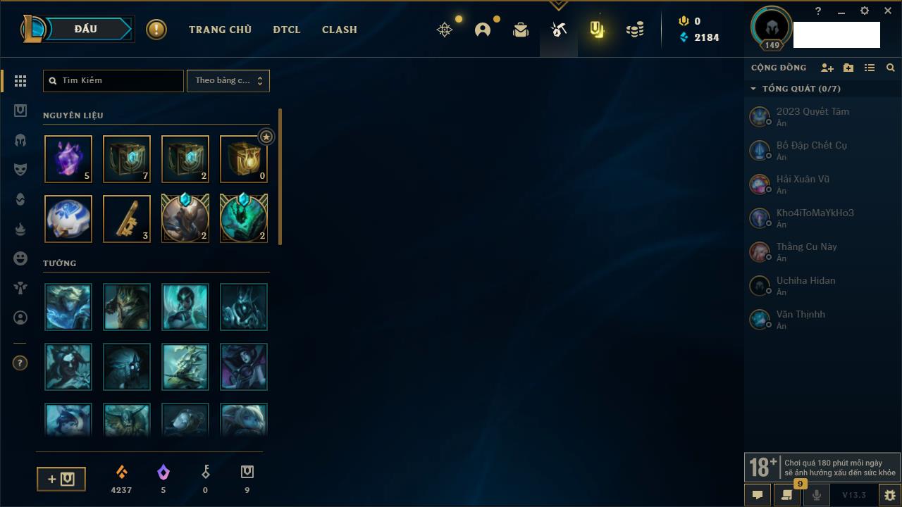 Rank Đơn: Chưa RankKhung: Chưa có khungTướng: 162 - Còn 23234 THXTrang Phục: 150Rank ĐTCL: Chưa RankLinh Thú: 42