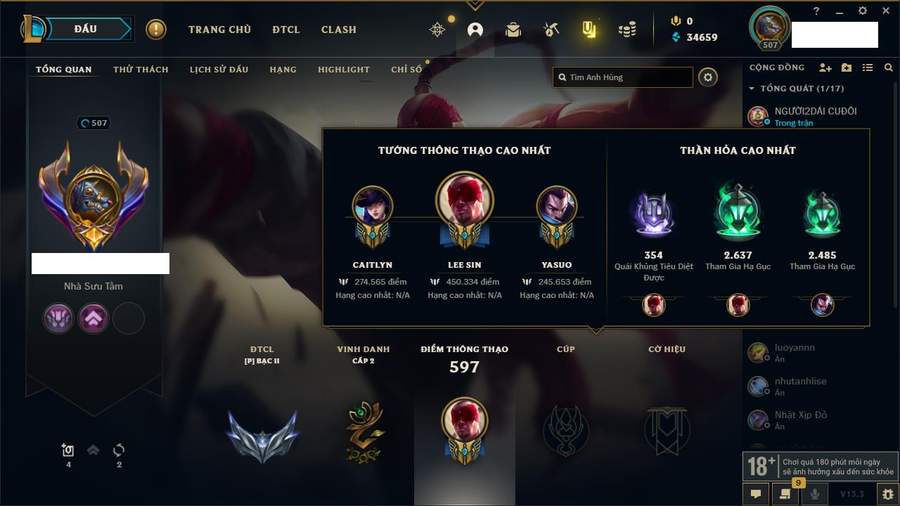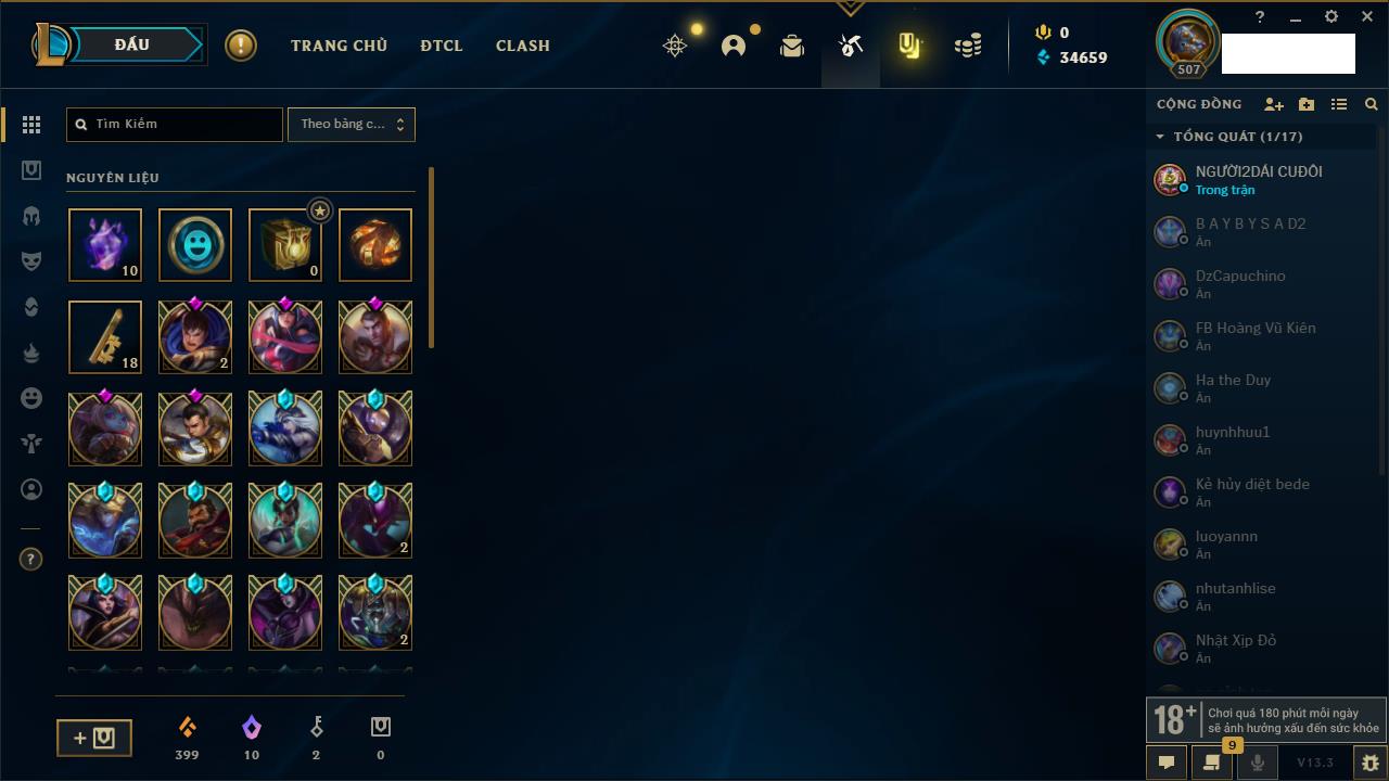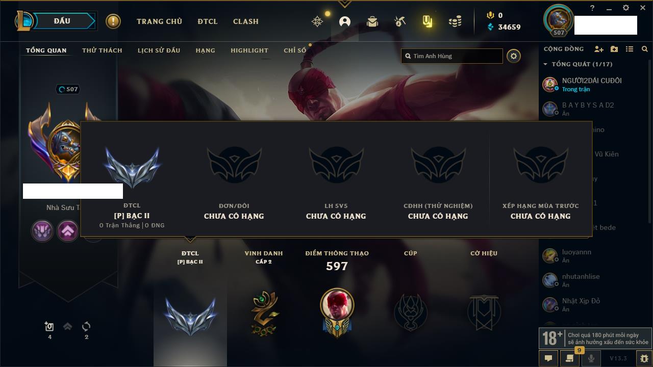 Rank Đơn: Đồng IIKhung: Chưa có khungTướng: 170 - Còn 56487 THXTrang Phục: 90Rank ĐTCL: Chưa RankLinh Thú: 129