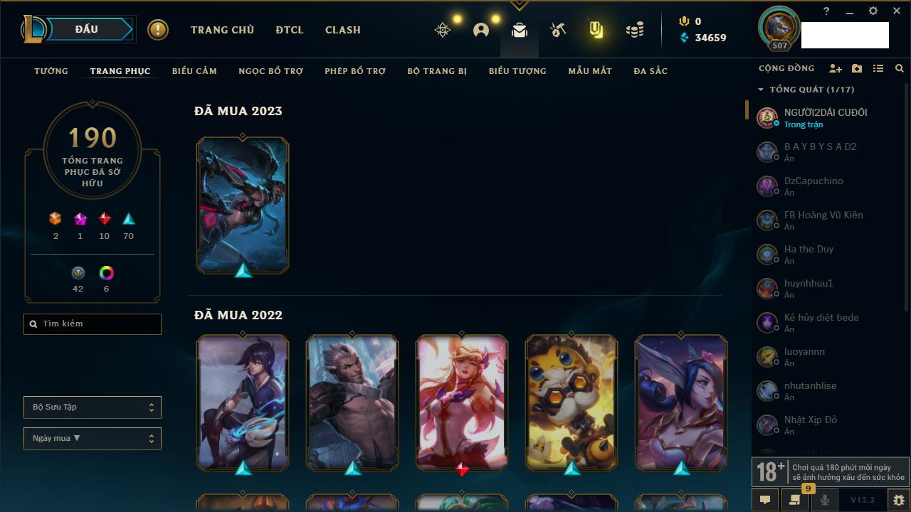 Rank Đơn: Vàng IIIKhung: VàngTướng: 170 - Còn 33222 THXTrang Phục: 136Rank ĐTCL: Chưa RankLinh Thú: 40