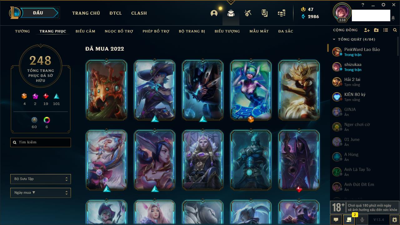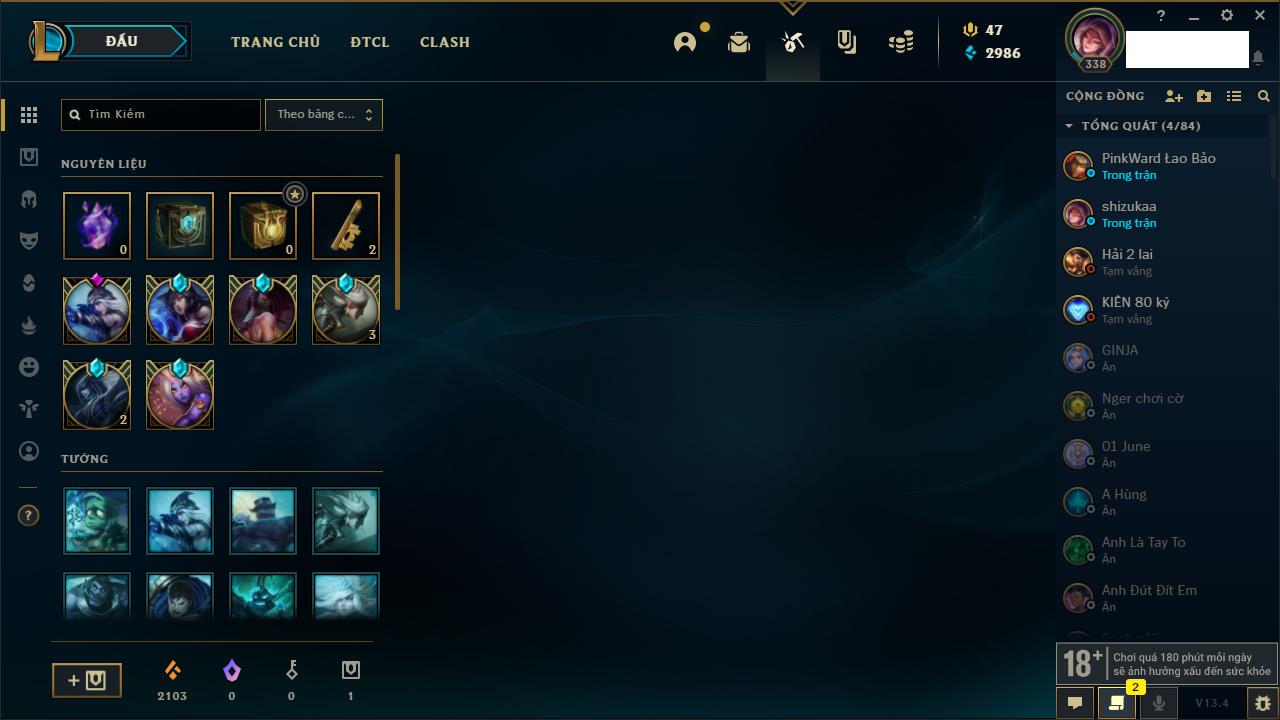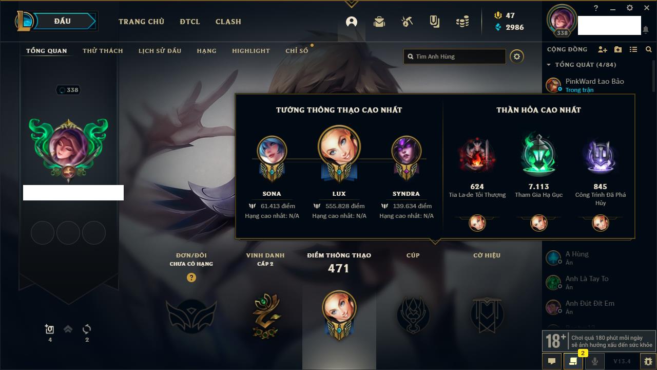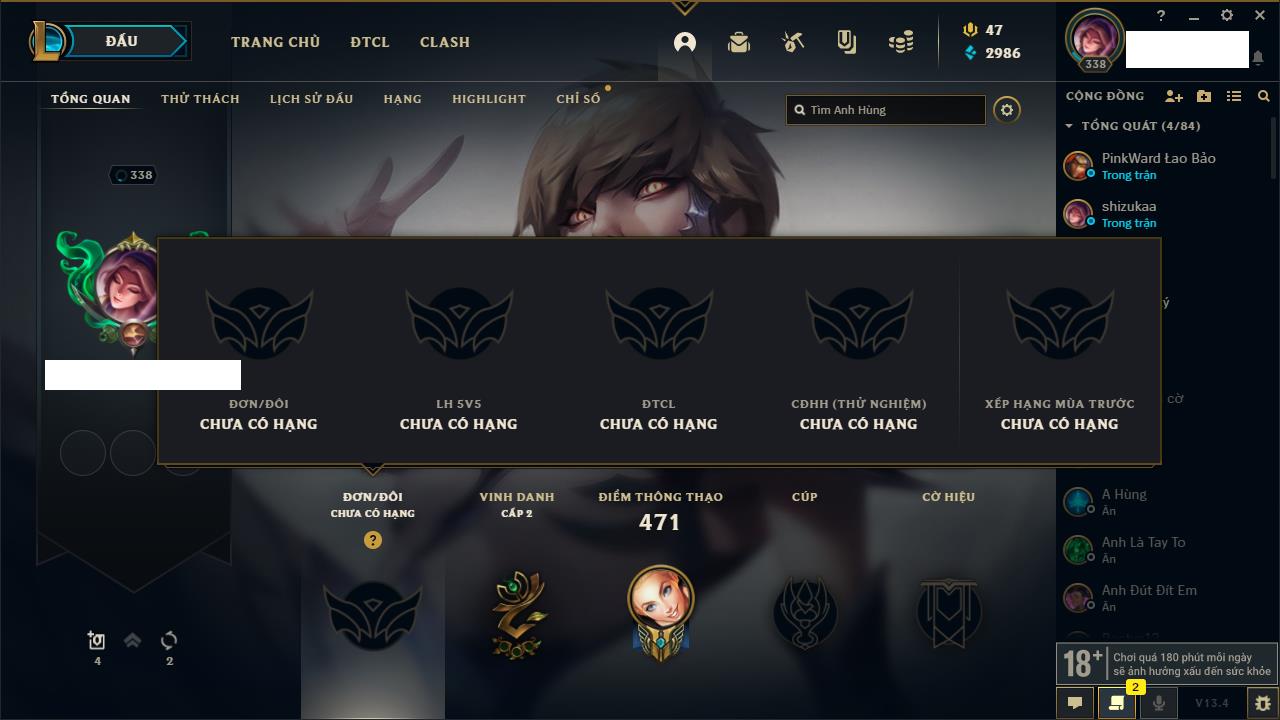 Rank Đơn: Vàng IIKhung: VàngTướng: 171 - Còn 34018 THXTrang Phục: 250Rank ĐTCL: Sắt IILinh Thú: 19