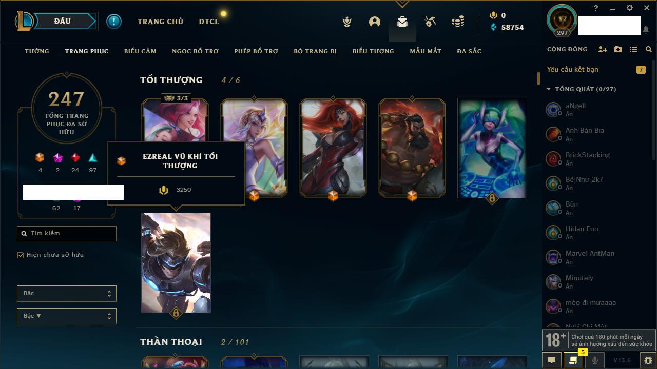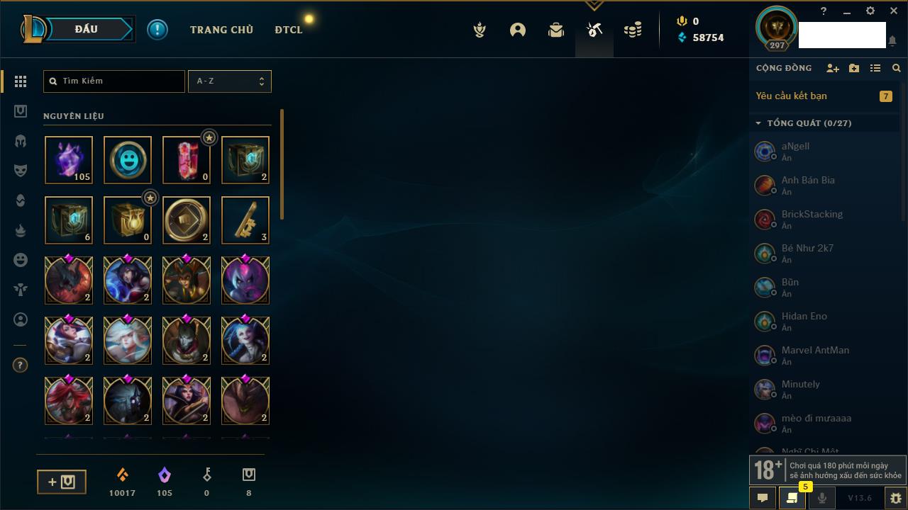 Rank Đơn: Bạc IIIKhung: BạcTướng: 171 - Còn 51045 THXTrang Phục: 220Rank ĐTCL: Sắt IILinh Thú: 141