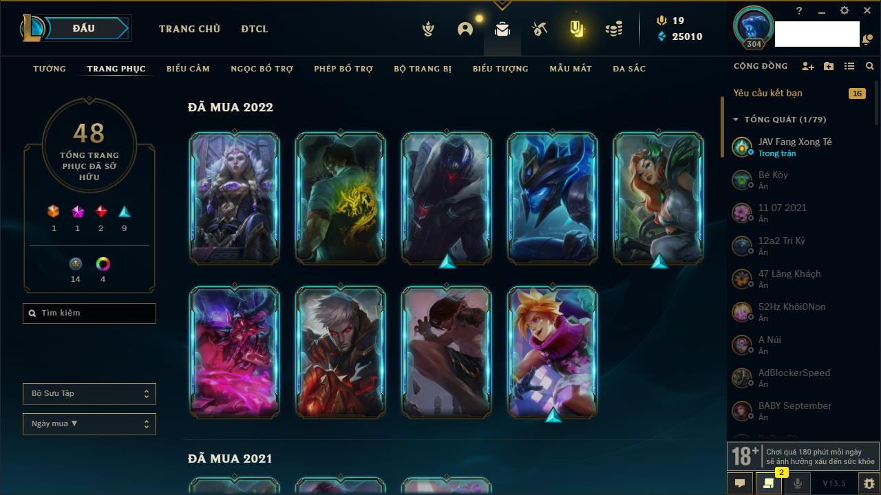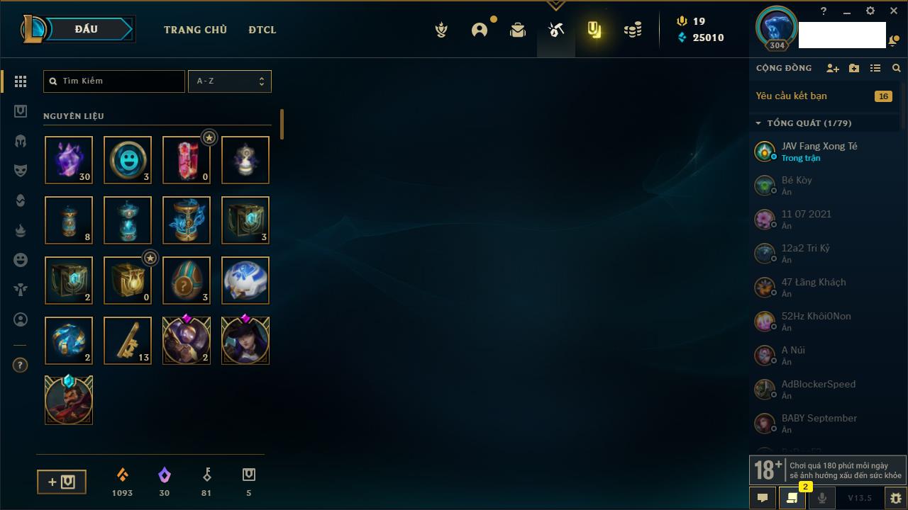Rank Đơn: Vàng IIKhung: VàngTướng: 171 - Còn 34018 THXTrang Phục: 250Rank ĐTCL: Sắt IILinh Thú: 19