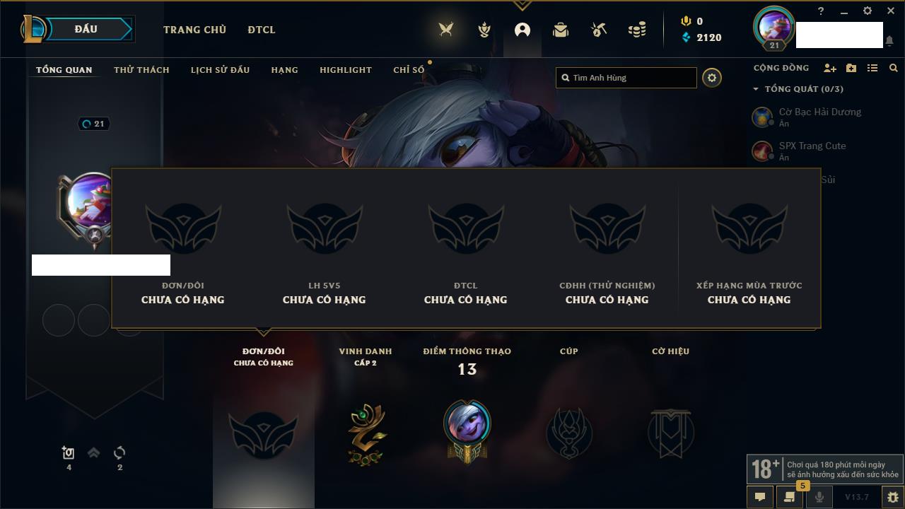 Rank Đơn: Chưa rank mùa nàoKhung: Chưa có khungTướng: 0 - Còn 2000 THXTrang Phục: 0Rank ĐTCL: Chưa RankLinh Thú: 19