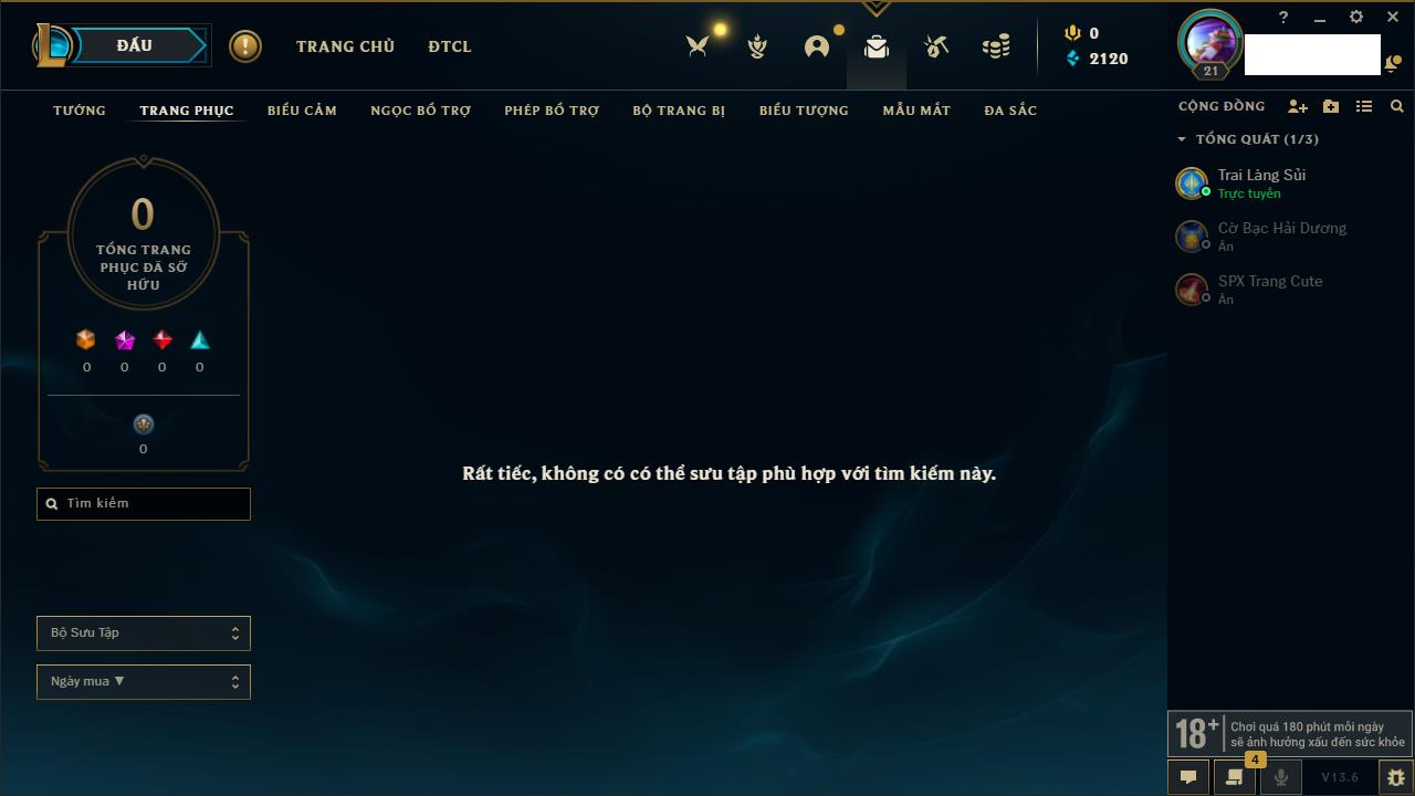 Rank Đơn: Chưa rank mùa nàoKhung: Chưa có khungTướng: 0 - Còn 0 THXTrang Phục: 0Rank ĐTCL: Chưa RankLinh Thú: 21
