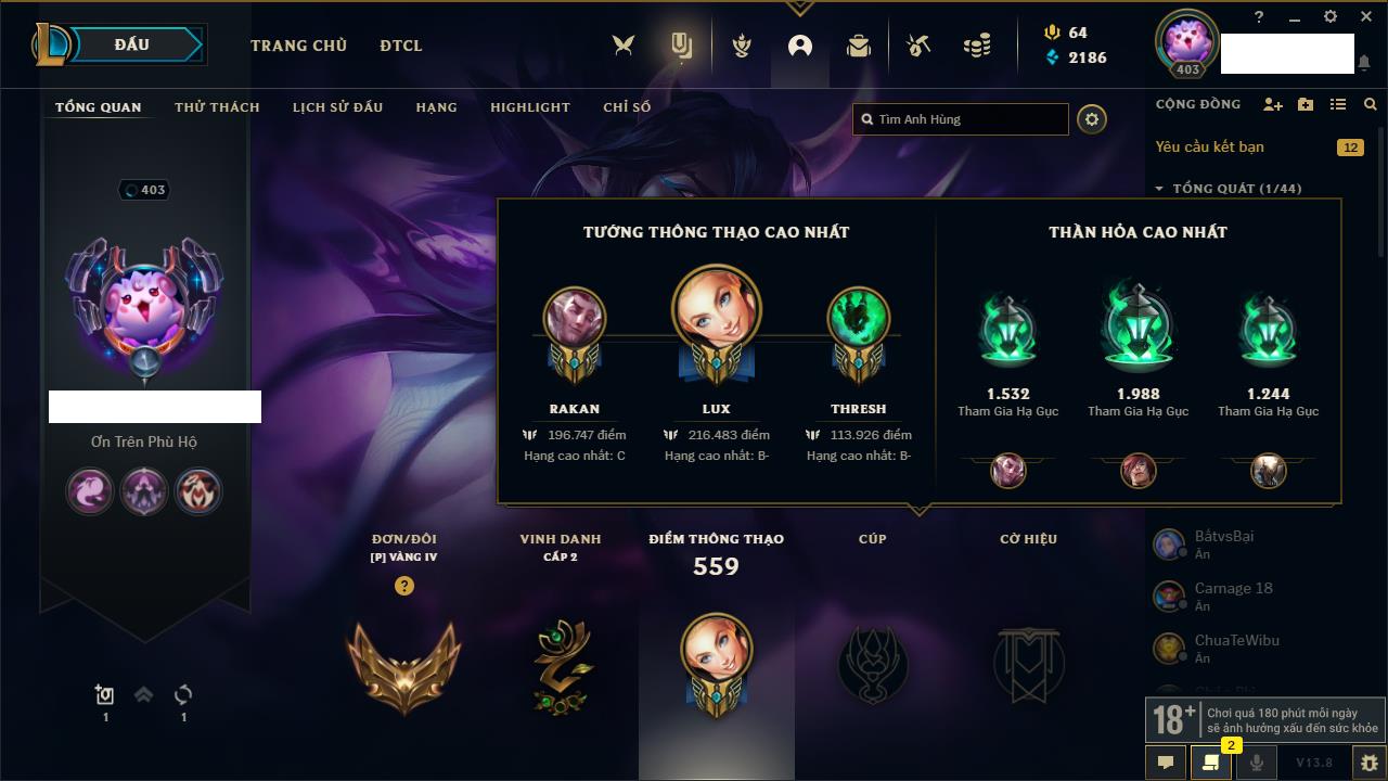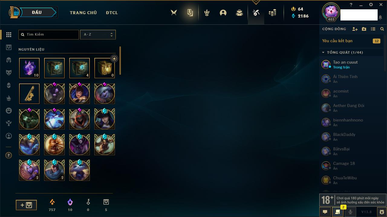 Rank Đơn: Vàng IIKhung: VàngTướng: 171 - Còn 34018 THXTrang Phục: 250Rank ĐTCL: Sắt IILinh Thú: 19