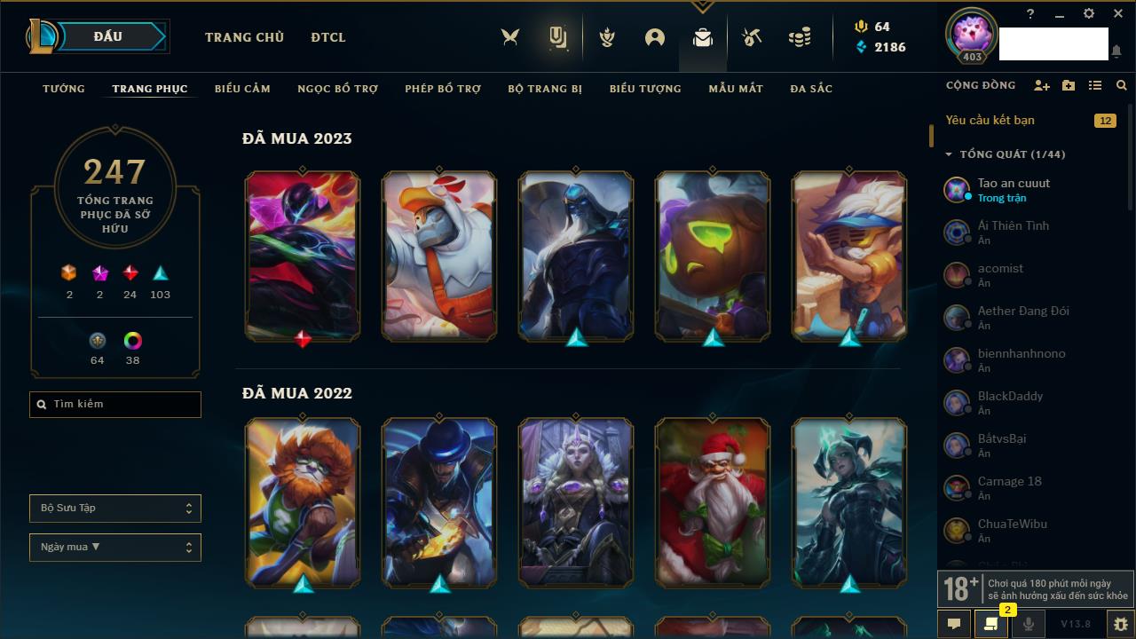 Rank Đơn: Vàng IIIKhung: VàngTướng: 161 - Còn 162202 THXTrang Phục: 179Rank ĐTCL: Chưa RankLinh Thú: 20