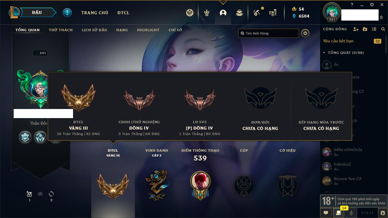 Rank Đơn: Bạch Kim IIIKhung: VàngTướng: 126 - Còn 23055 THXTrang Phục: 114Rank ĐTCL: Chưa RankLinh Thú: 21