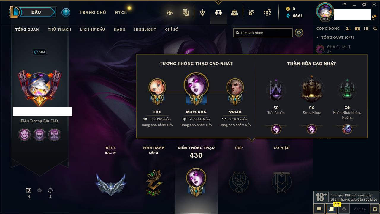 Rank Đơn: Lục Bảo IVKhung: Chưa có khungTướng: 171 - Còn 165973 THXTrang Phục: 160Rank ĐTCL: Chưa RankLinh Thú: 9