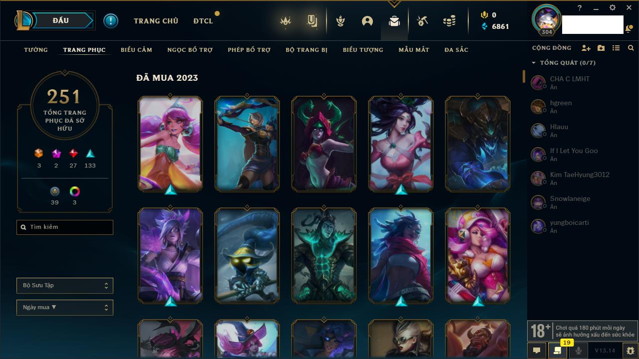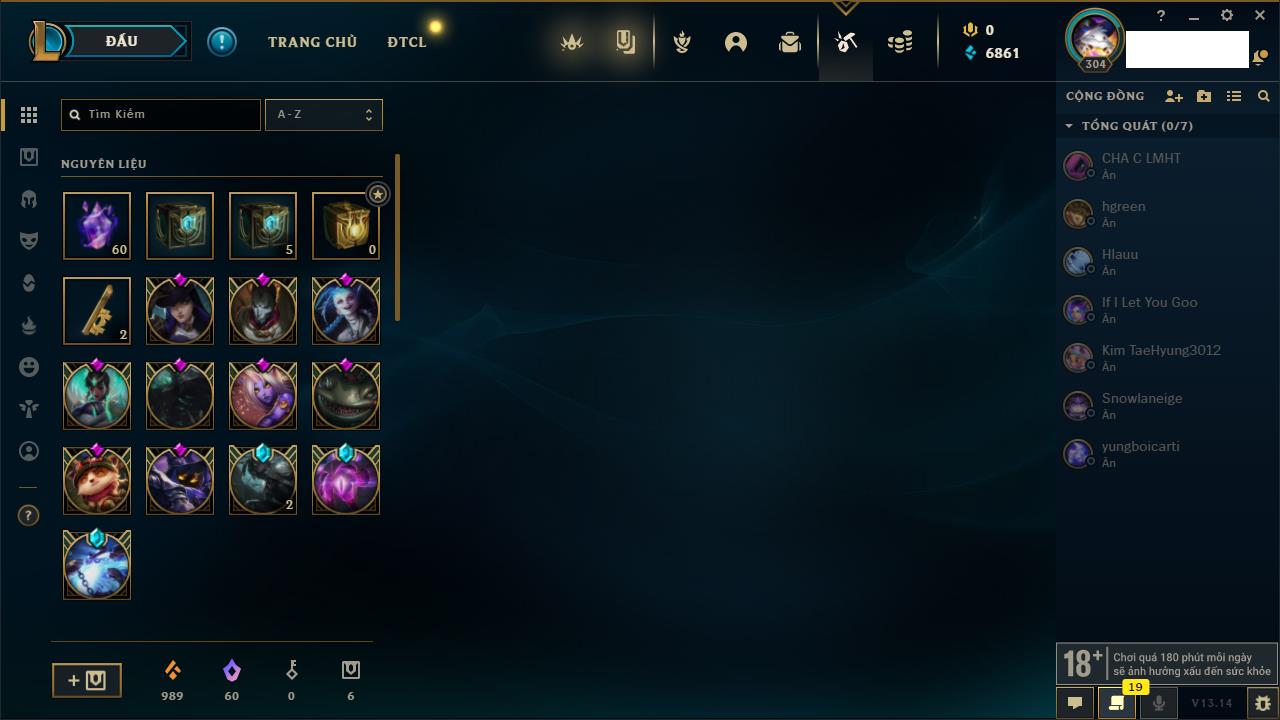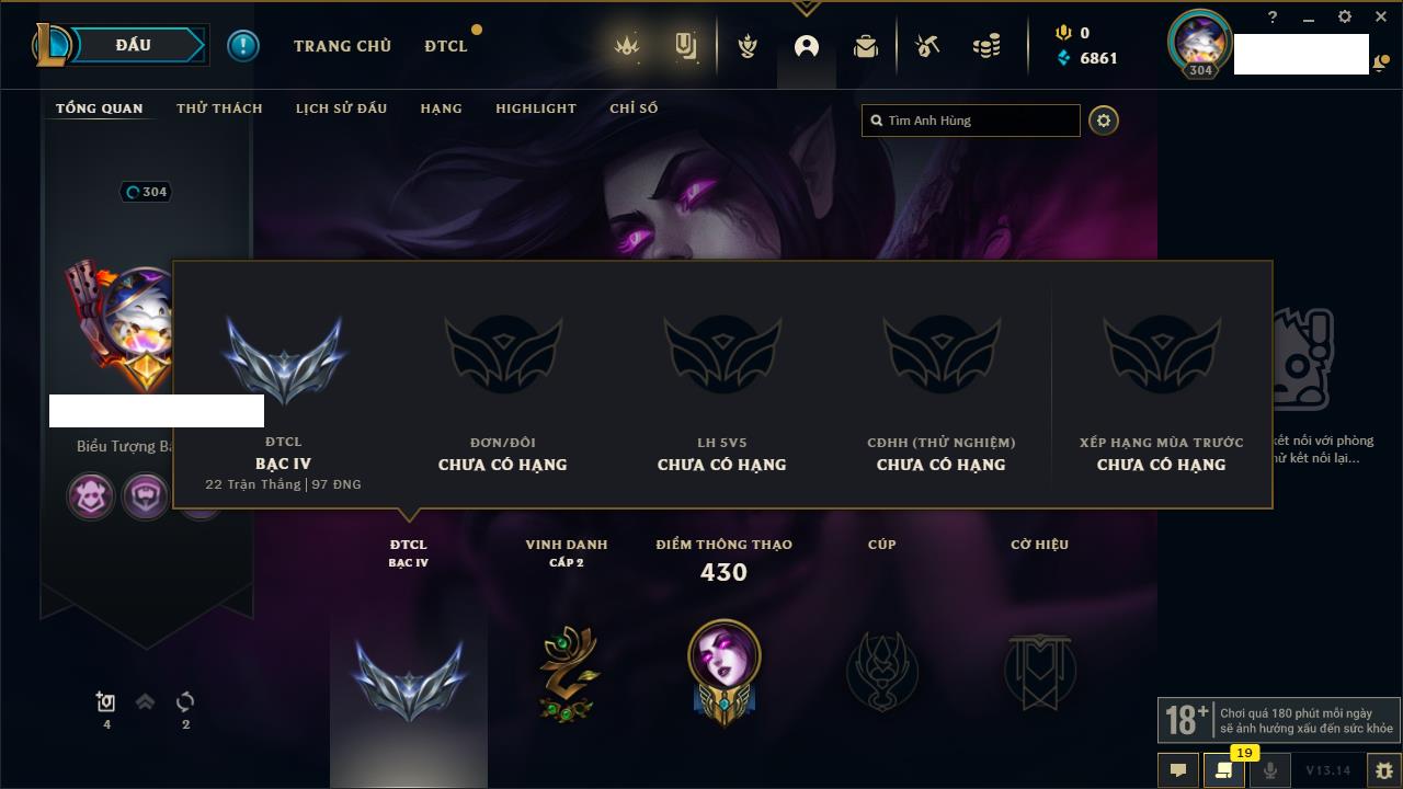 Rank Đơn: Vàng IIKhung: VàngTướng: 171 - Còn 34018 THXTrang Phục: 250Rank ĐTCL: Sắt IILinh Thú: 19
