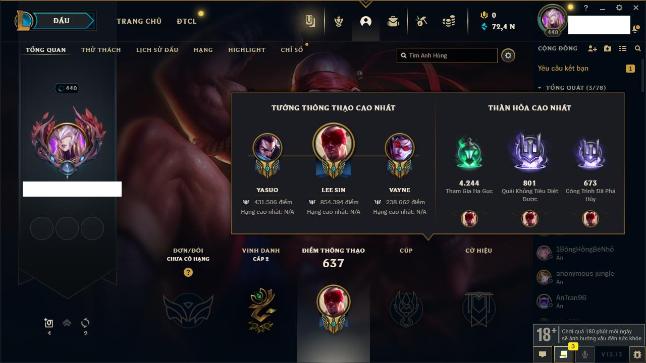 Rank Đơn: Đồng IIKhung: Chưa có khungTướng: 170 - Còn 56487 THXTrang Phục: 90Rank ĐTCL: Chưa RankLinh Thú: 129