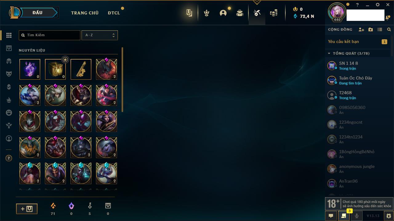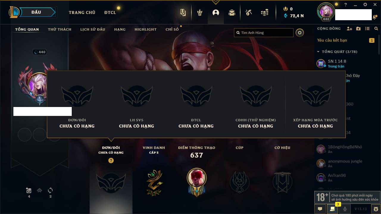 Rank Đơn: Vàng IVKhung: VàngTướng: 146 - Còn 89110 THXTrang Phục: 63Rank ĐTCL: Vàng IIILinh Thú: 41