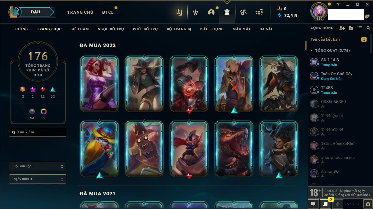 Rank Đơn: Vàng IIIKhung: VàngTướng: 170 - Còn 33222 THXTrang Phục: 136Rank ĐTCL: Chưa RankLinh Thú: 40