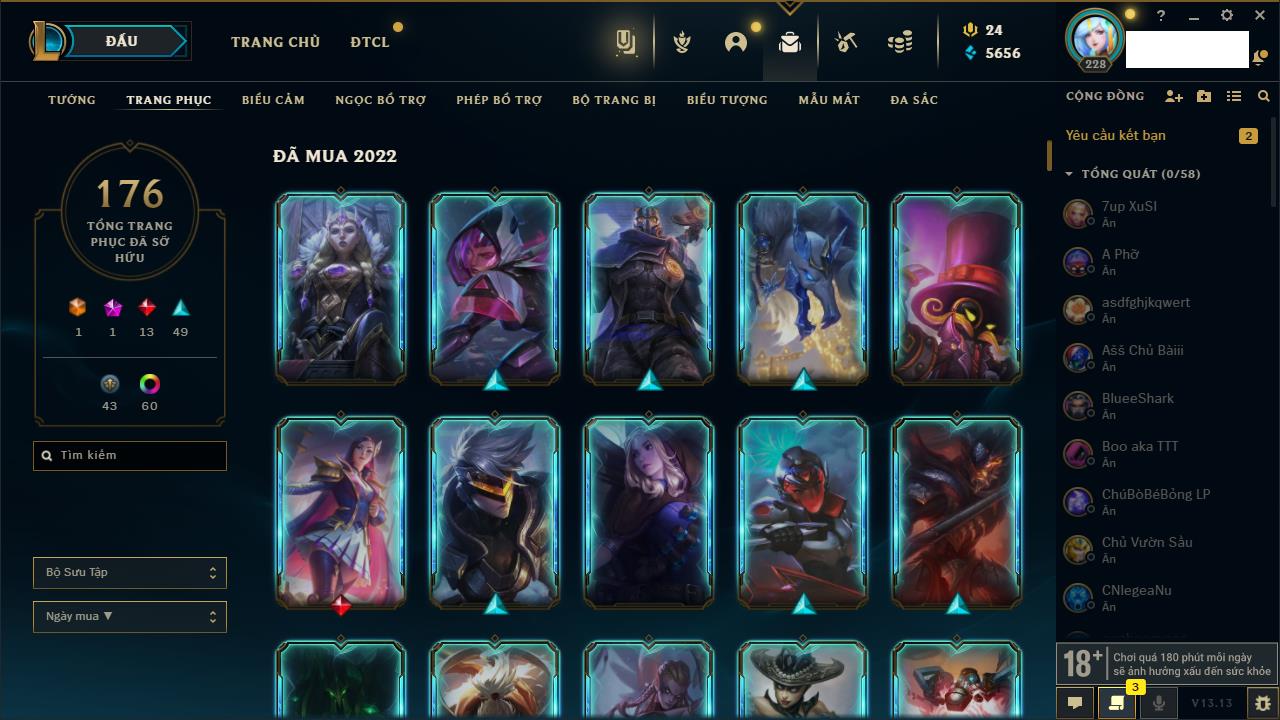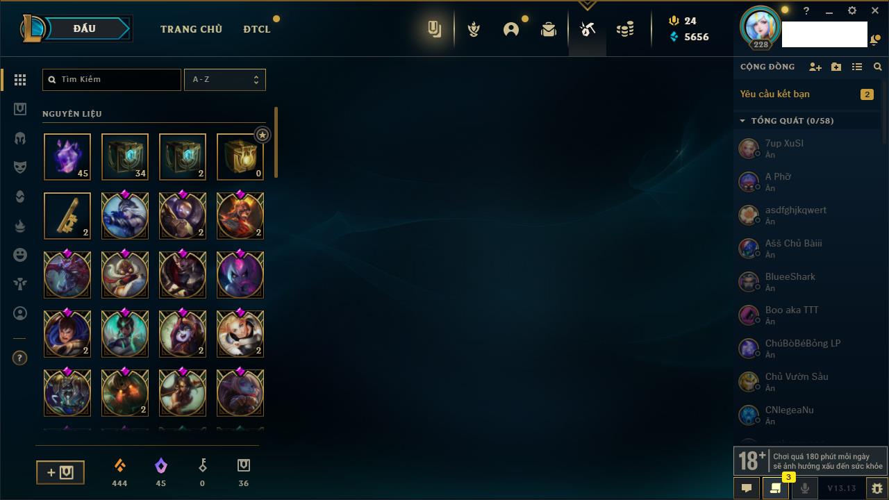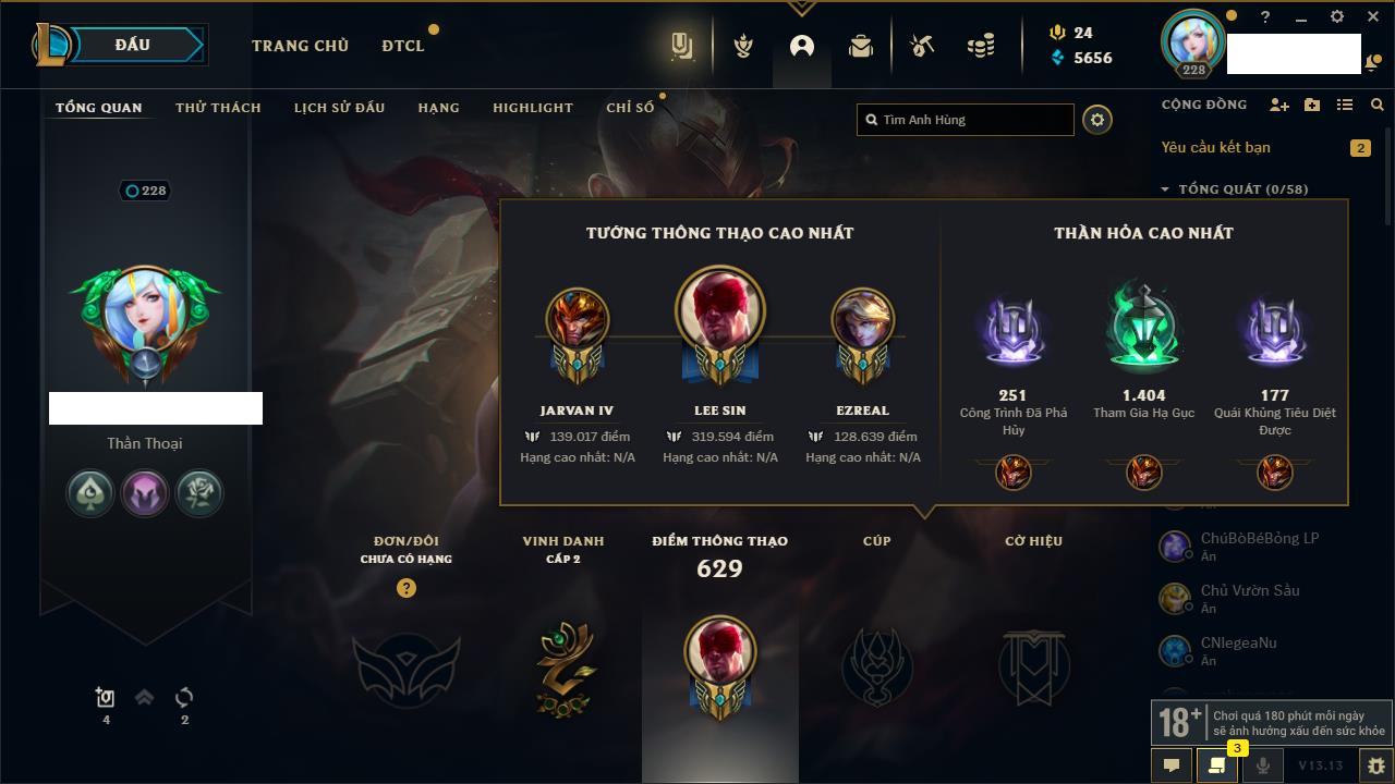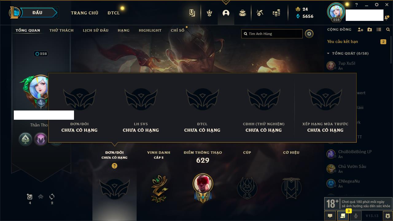 Rank Đơn: Đồng IIKhung: Chưa có khungTướng: 170 - Còn 56487 THXTrang Phục: 90Rank ĐTCL: Chưa RankLinh Thú: 129