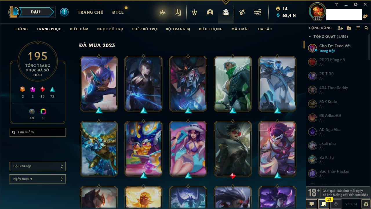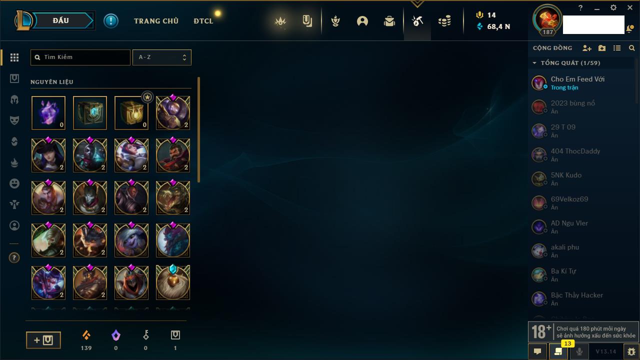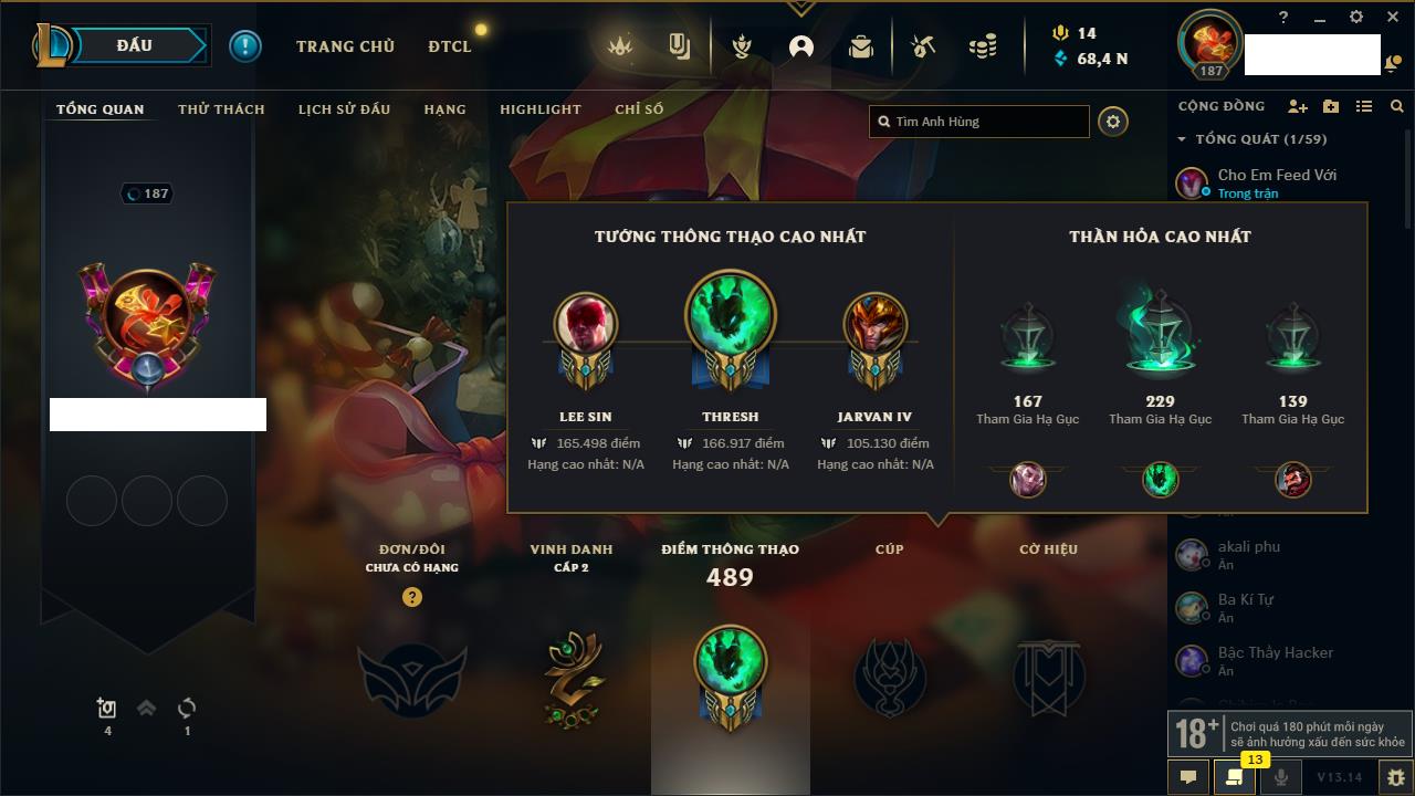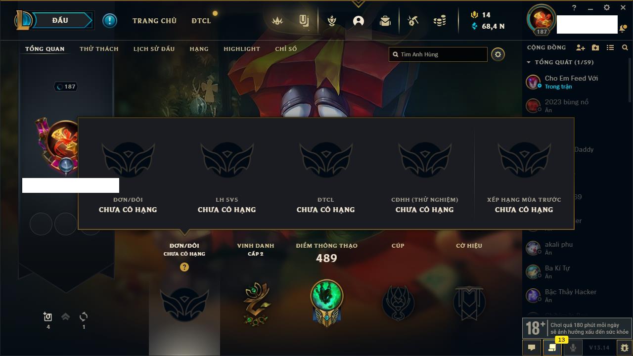 Rank Đơn: Vàng IVKhung: VàngTướng: 171 - Còn 48721 THXTrang Phục: 171Rank ĐTCL: Chưa RankLinh Thú: 27