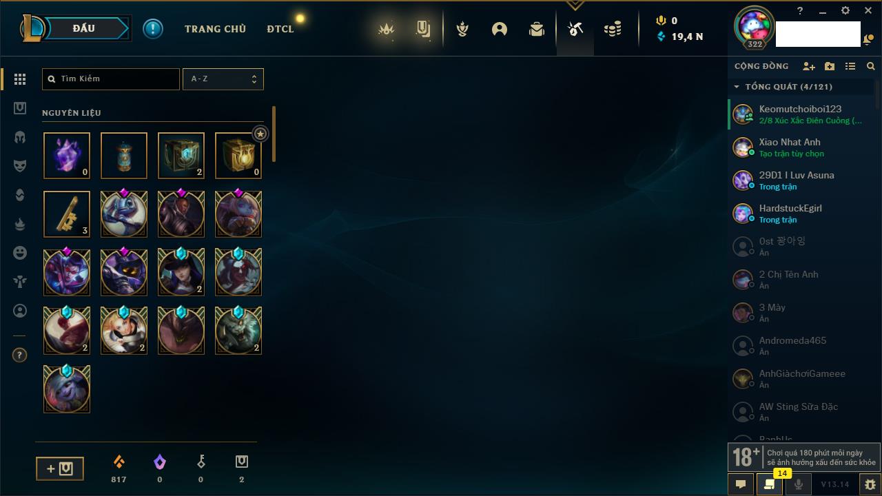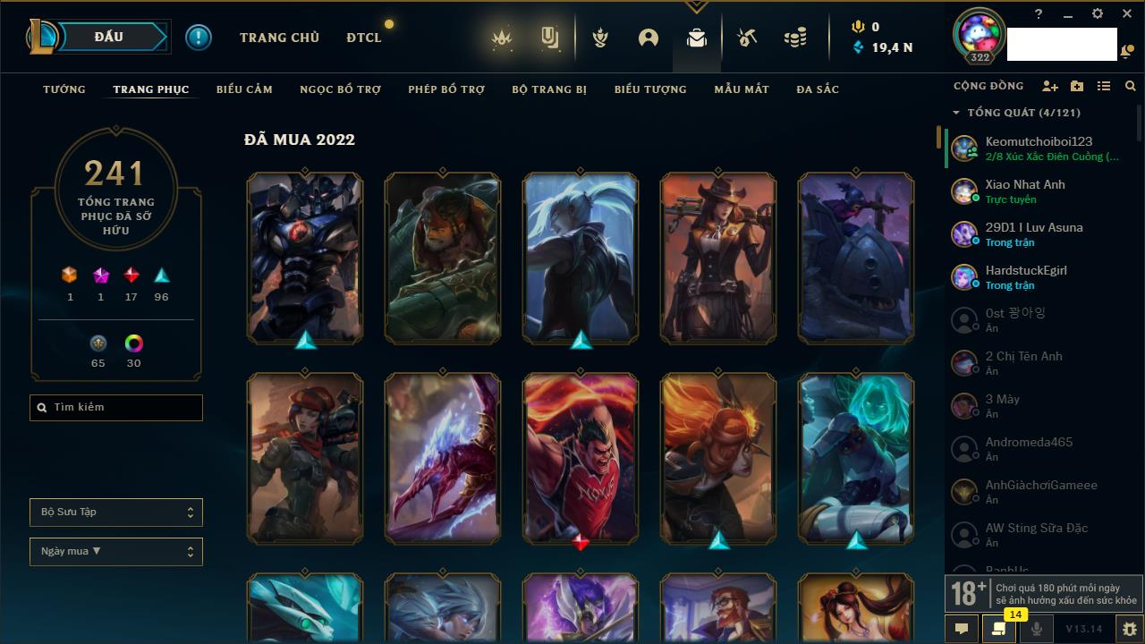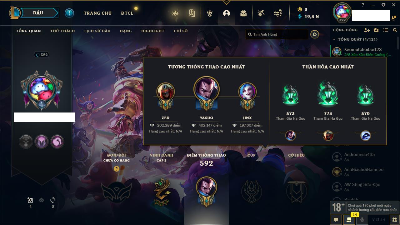 Rank Đơn: Bạc IIIKhung: BạcTướng: 171 - Còn 51045 THXTrang Phục: 220Rank ĐTCL: Sắt IILinh Thú: 141