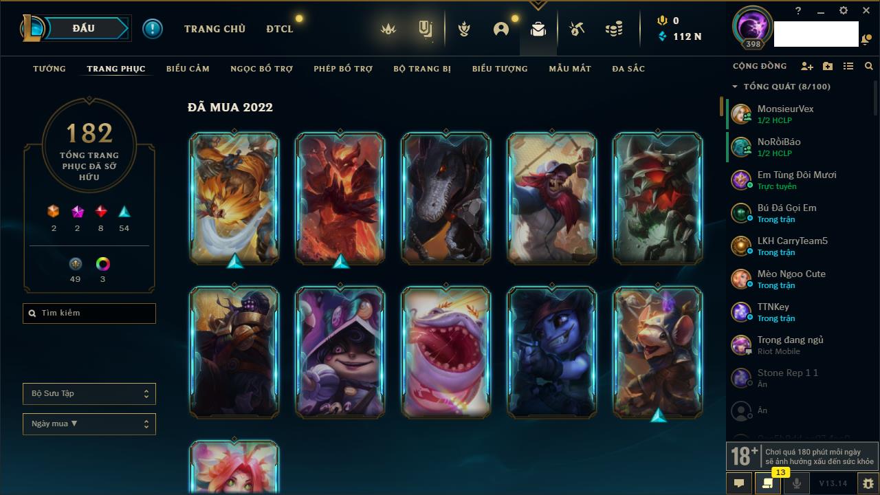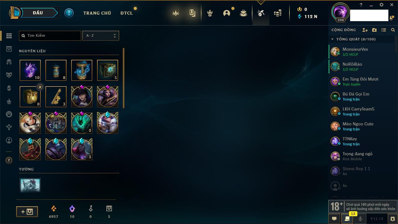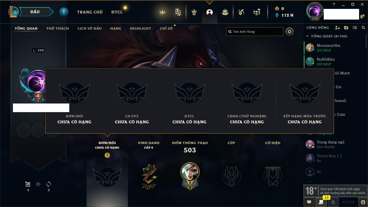 Rank Đơn: Chưa RankKhung: Chưa có khungTướng: 157 - Còn 6783 THXTrang Phục: 50Rank ĐTCL: Chưa RankLinh Thú: 37