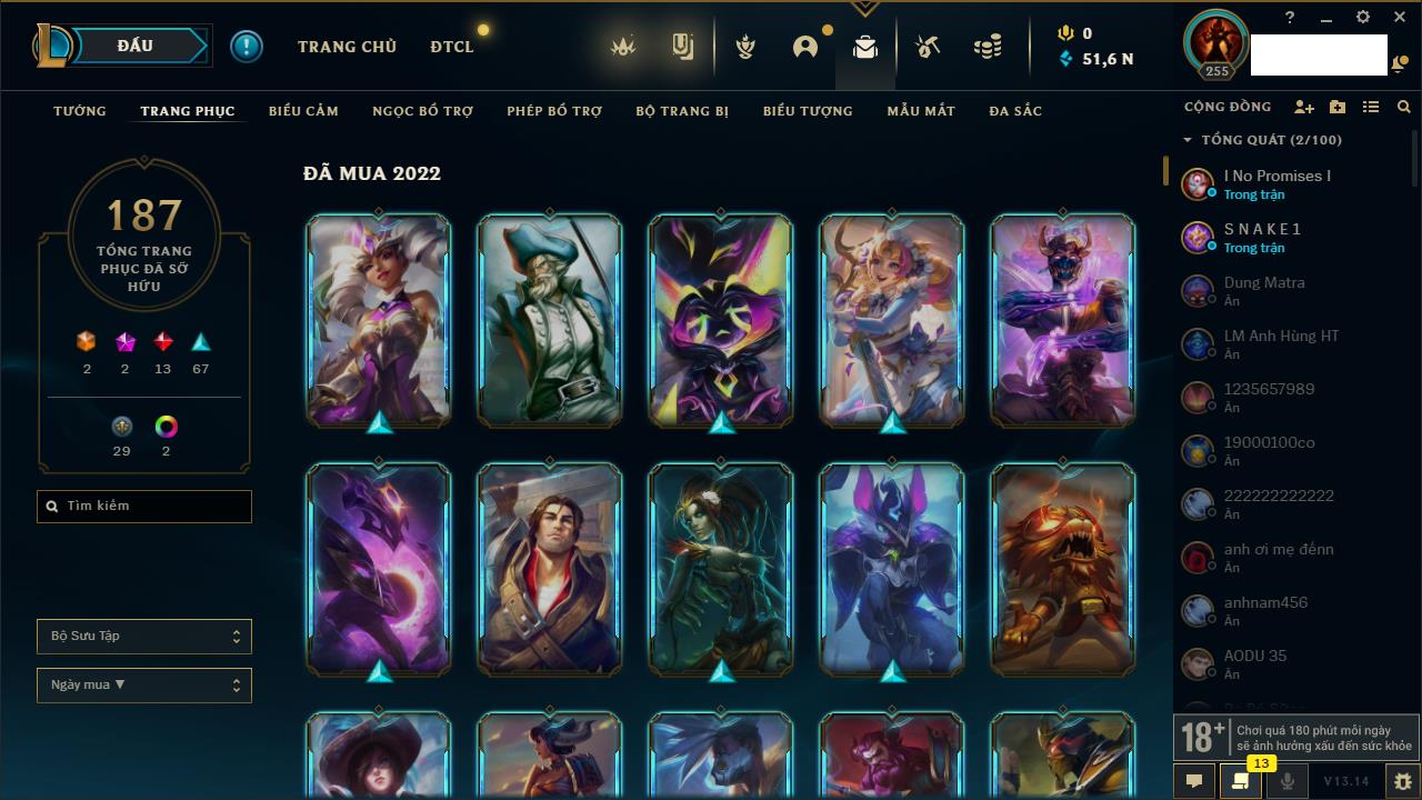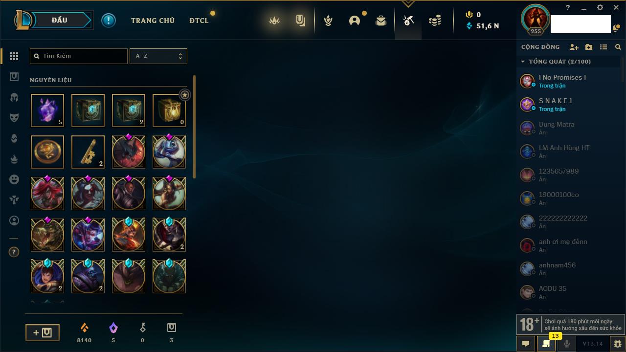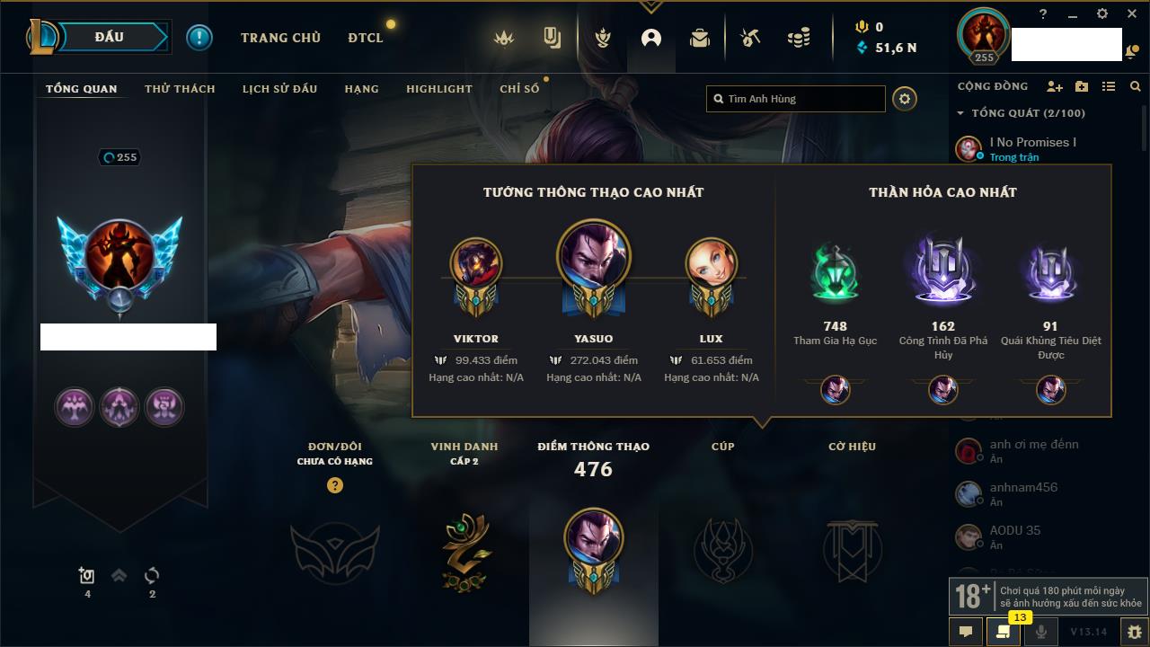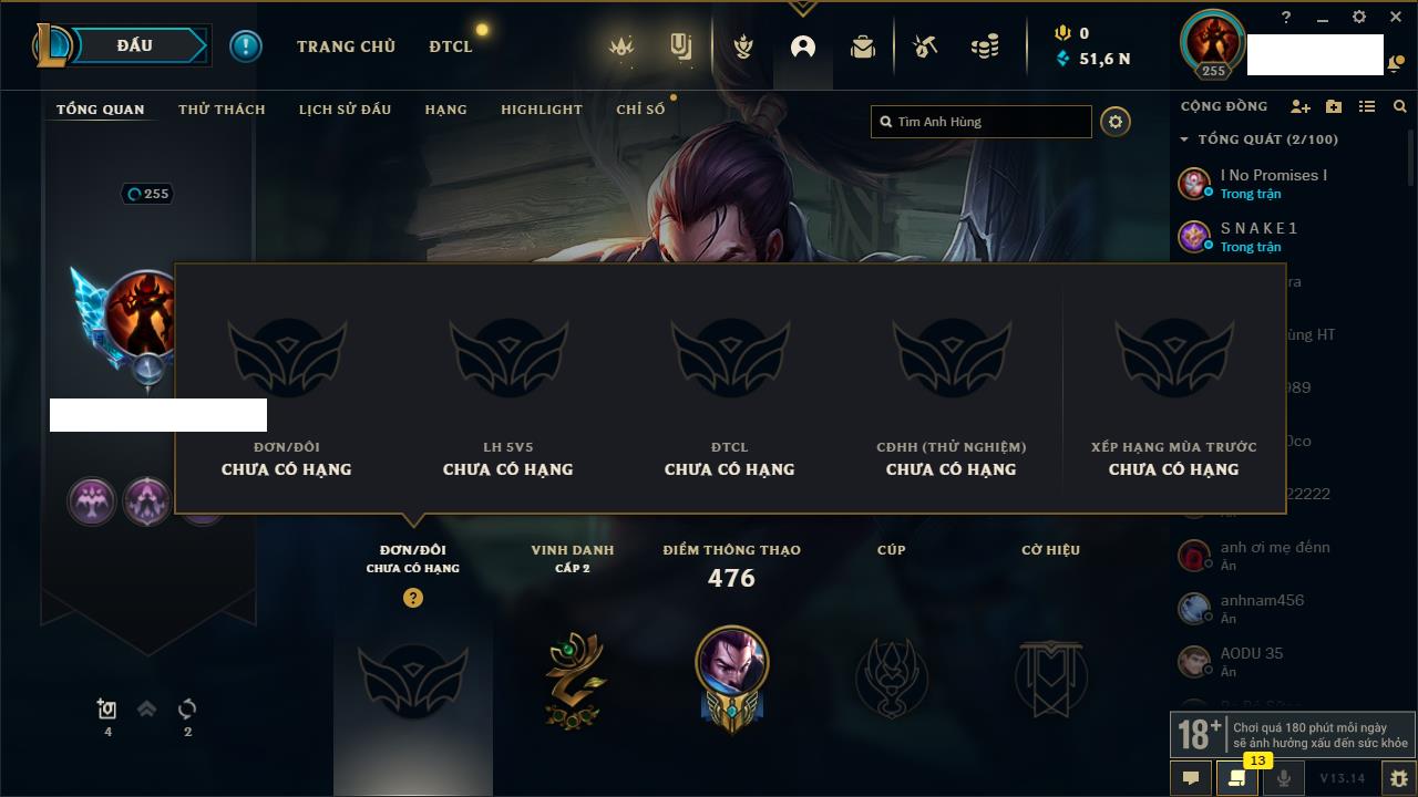 Rank Đơn: Đồng IIKhung: Chưa có khungTướng: 170 - Còn 56487 THXTrang Phục: 90Rank ĐTCL: Chưa RankLinh Thú: 129