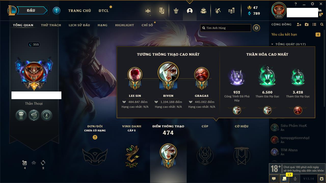 Rank Đơn: Bạc IVKhung: BạcTướng: 171 - Còn 7819 THXTrang Phục: 243Rank ĐTCL: Chưa RankLinh Thú: 102