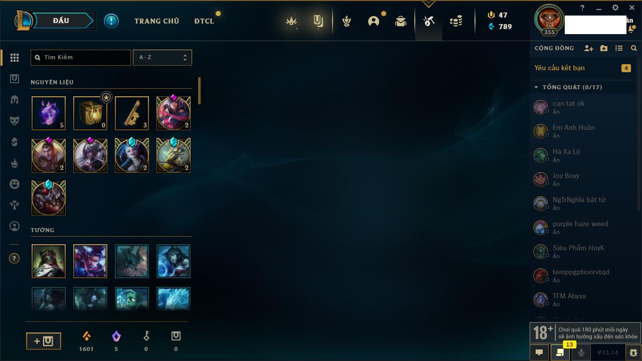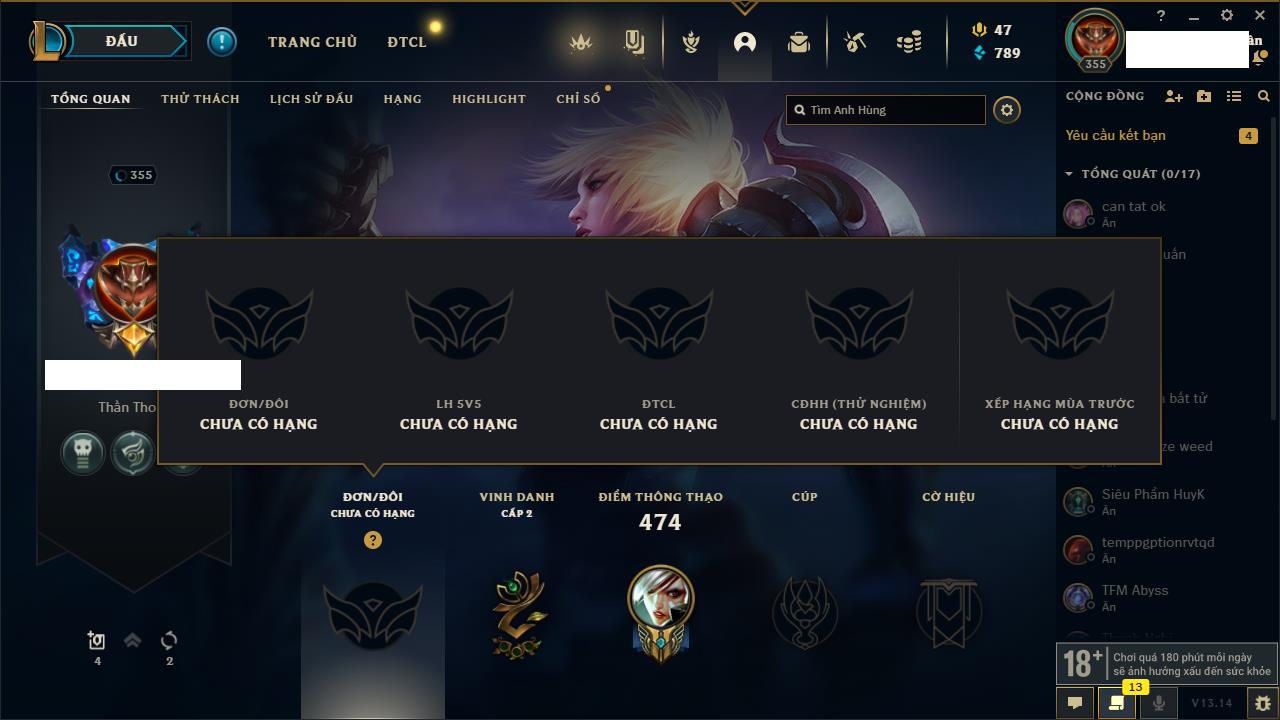 Rank Đơn: Bạc IIIKhung: Chưa có khungTướng: 171 - Còn 21493 THXTrang Phục: 252Rank ĐTCL: Bạch Kim IVLinh Thú: 123