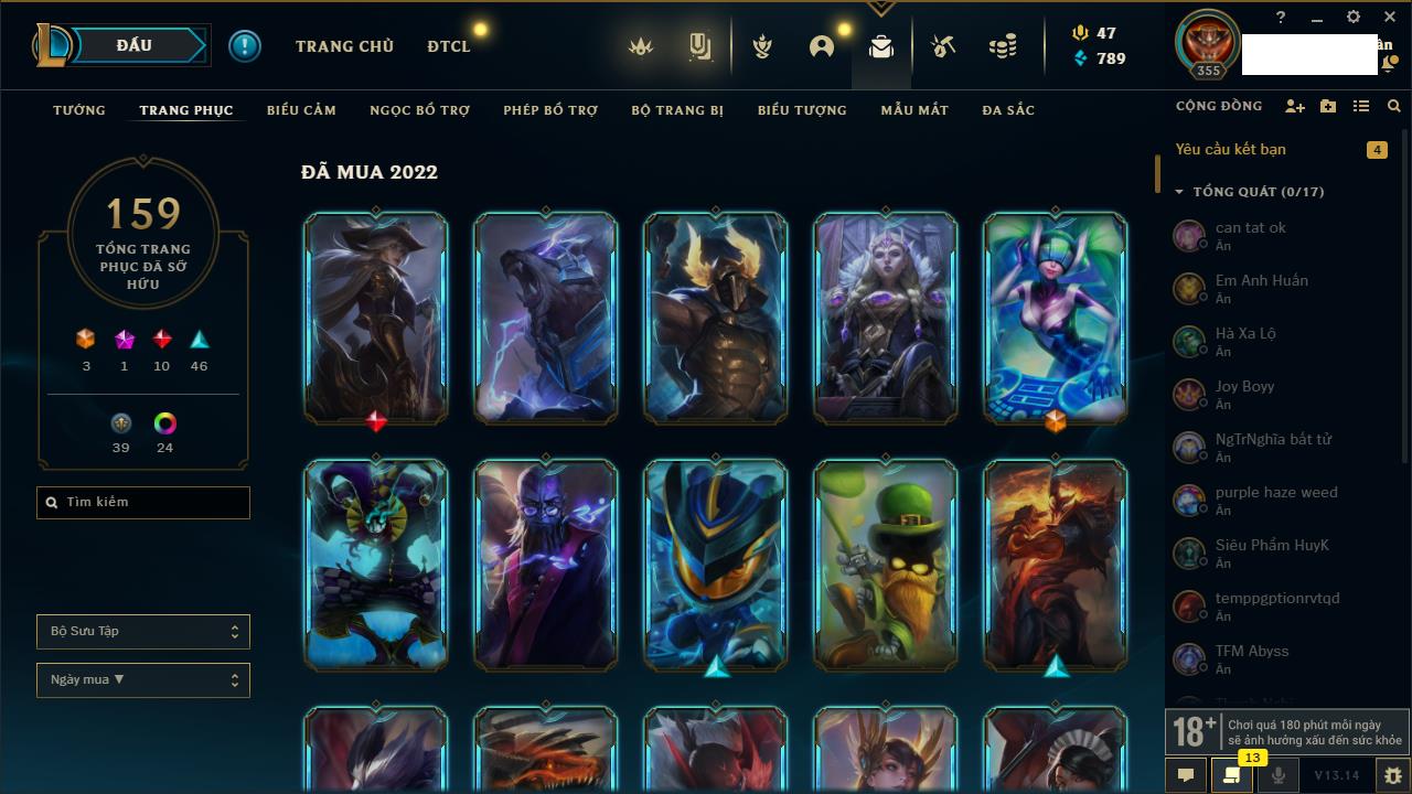 Rank Đơn: Vàng IIIKhung: VàngTướng: 161 - Còn 162202 THXTrang Phục: 179Rank ĐTCL: Chưa RankLinh Thú: 20
