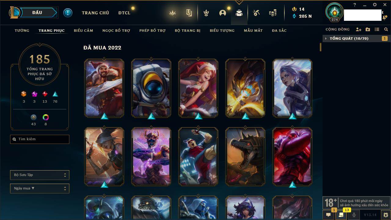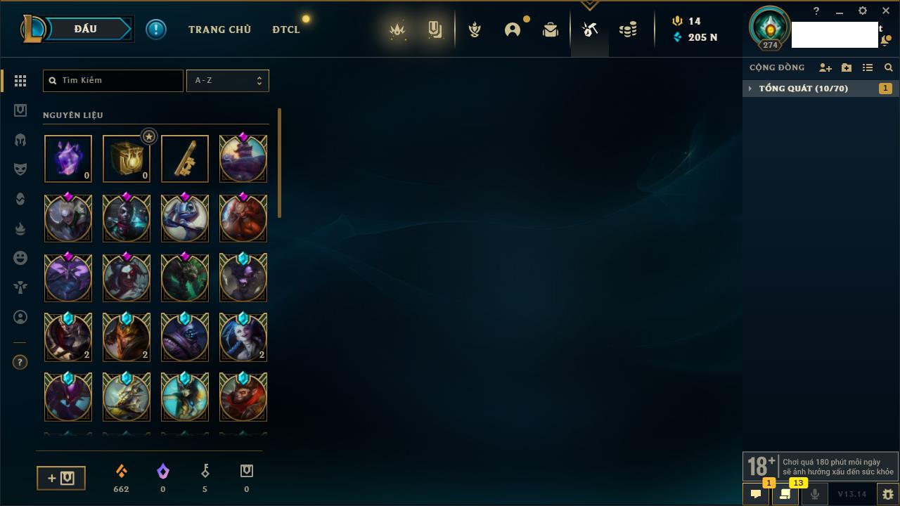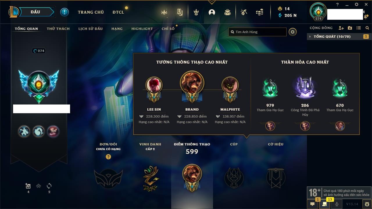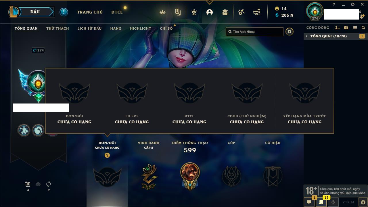 Rank Đơn: Chưa RankKhung: Chưa có khungTướng: 162 - Còn 205844 THXTrang Phục: 185Rank ĐTCL: Chưa RankLinh Thú: 75