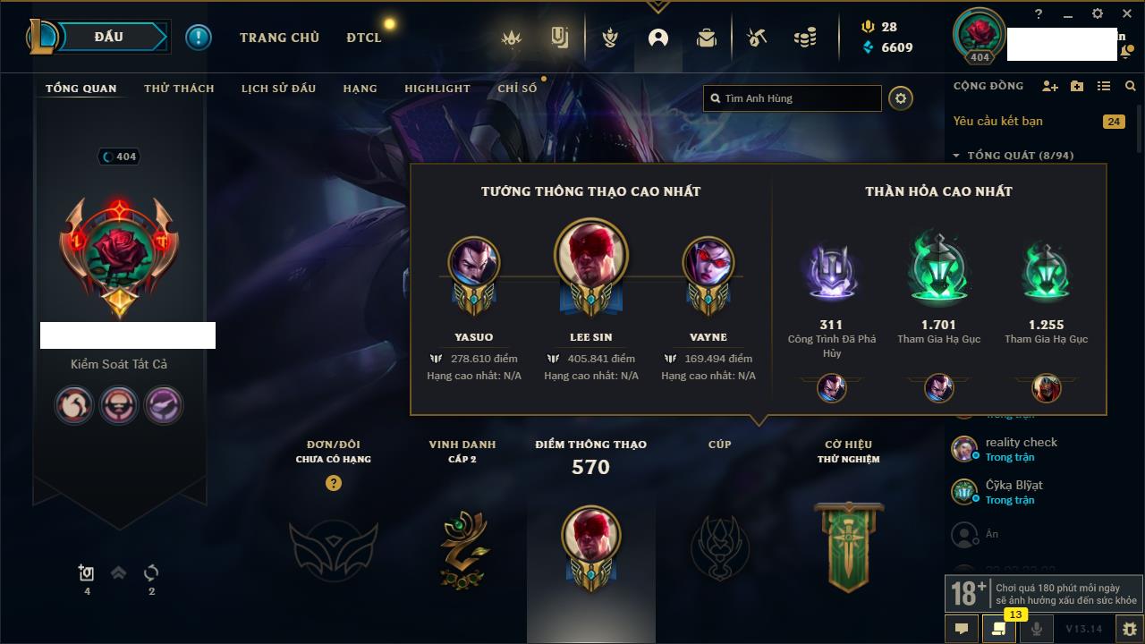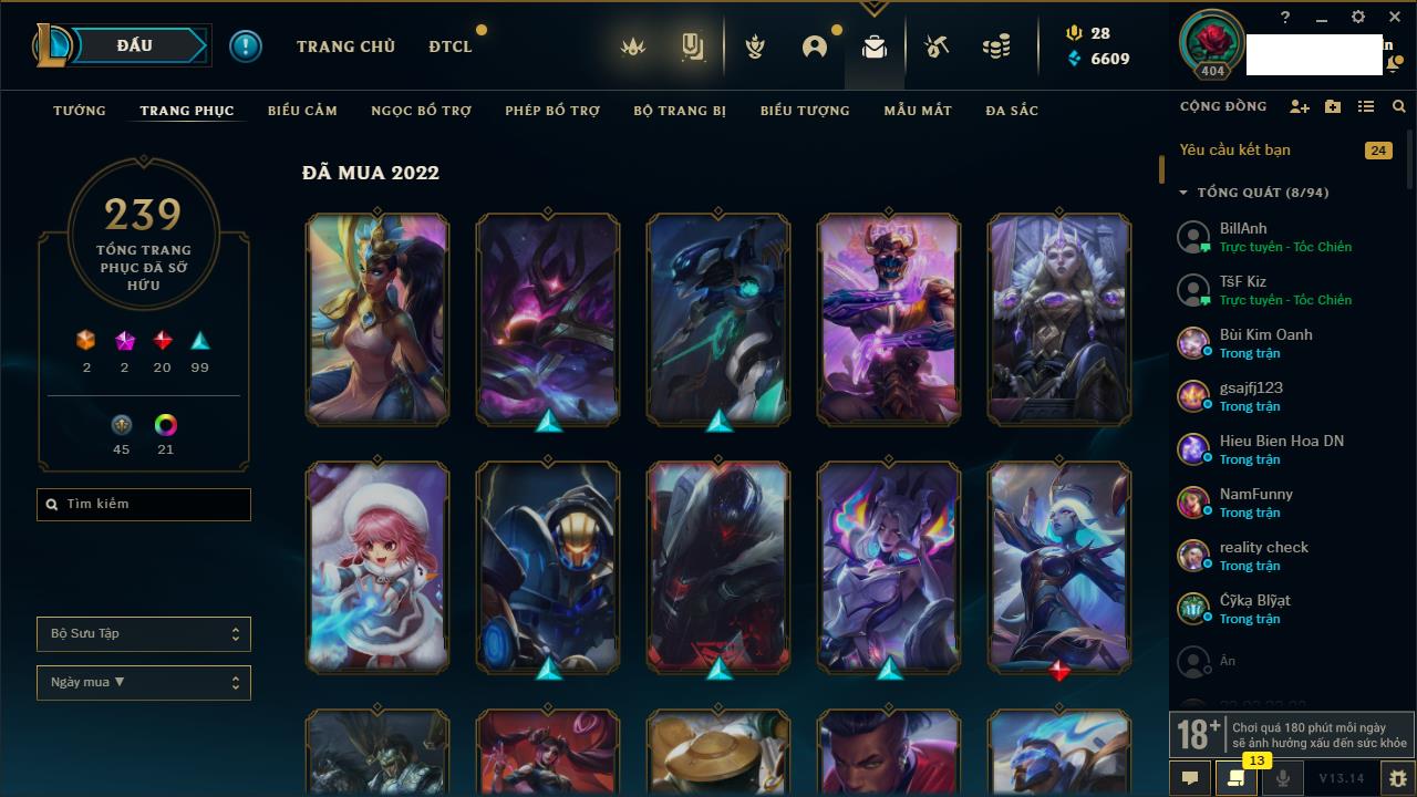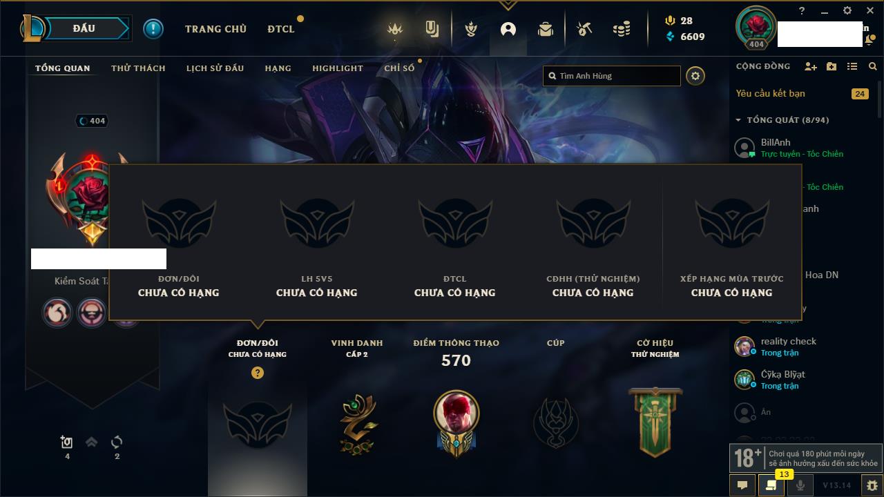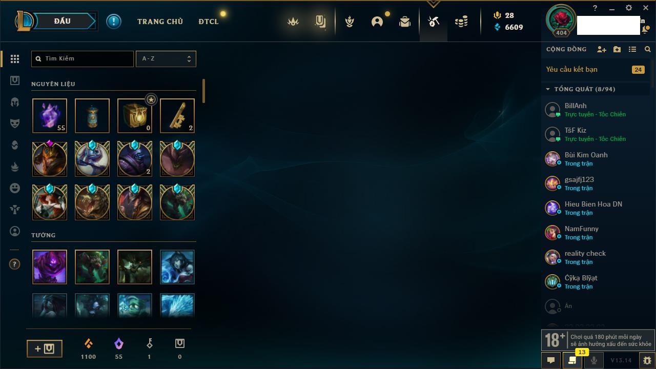 Rank Đơn: Bạc IIIKhung: BạcTướng: 171 - Còn 51045 THXTrang Phục: 220Rank ĐTCL: Sắt IILinh Thú: 141