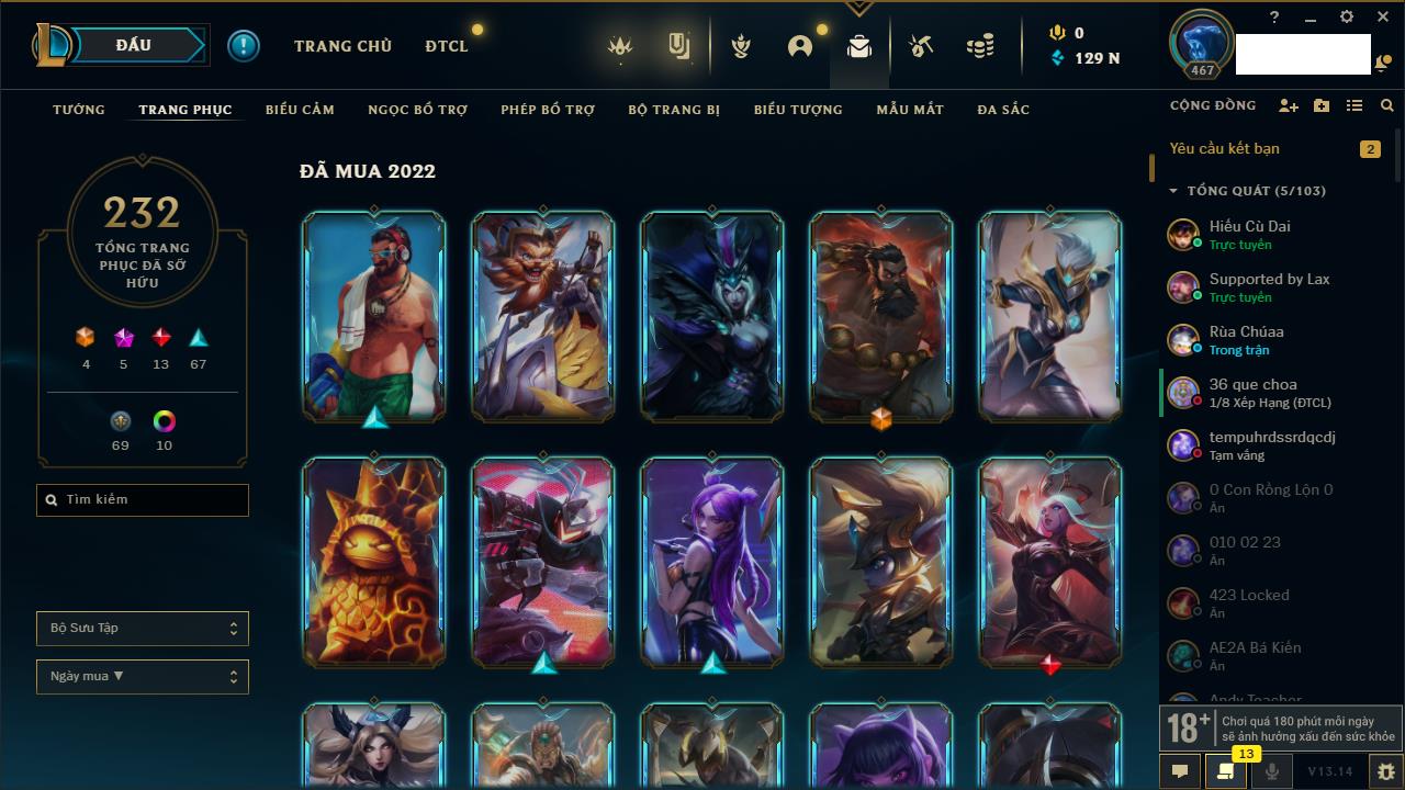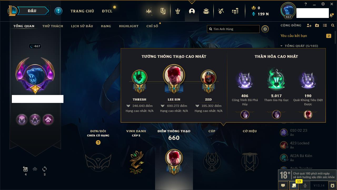 Rank Đơn: Vàng IIIKhung: BạcTướng: 171 - Còn 101359 THXTrang Phục: 88Rank ĐTCL: Kim Cương IVLinh Thú: 200