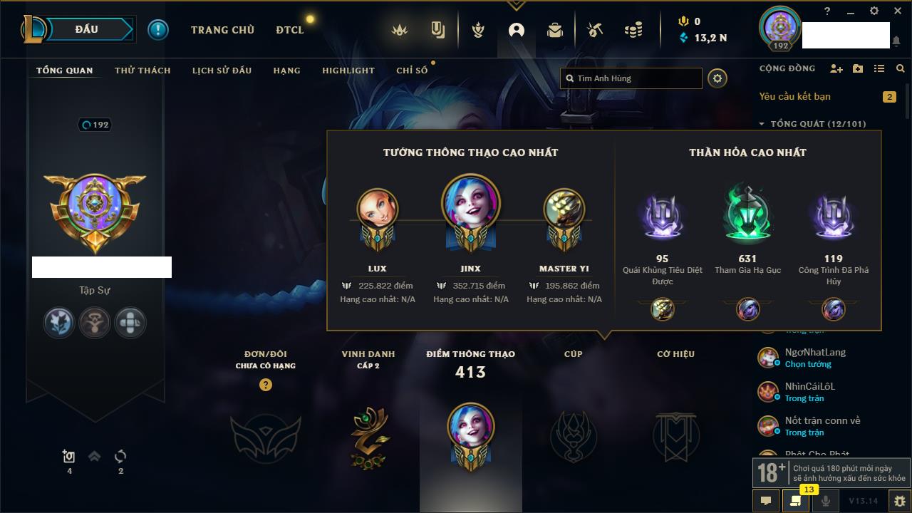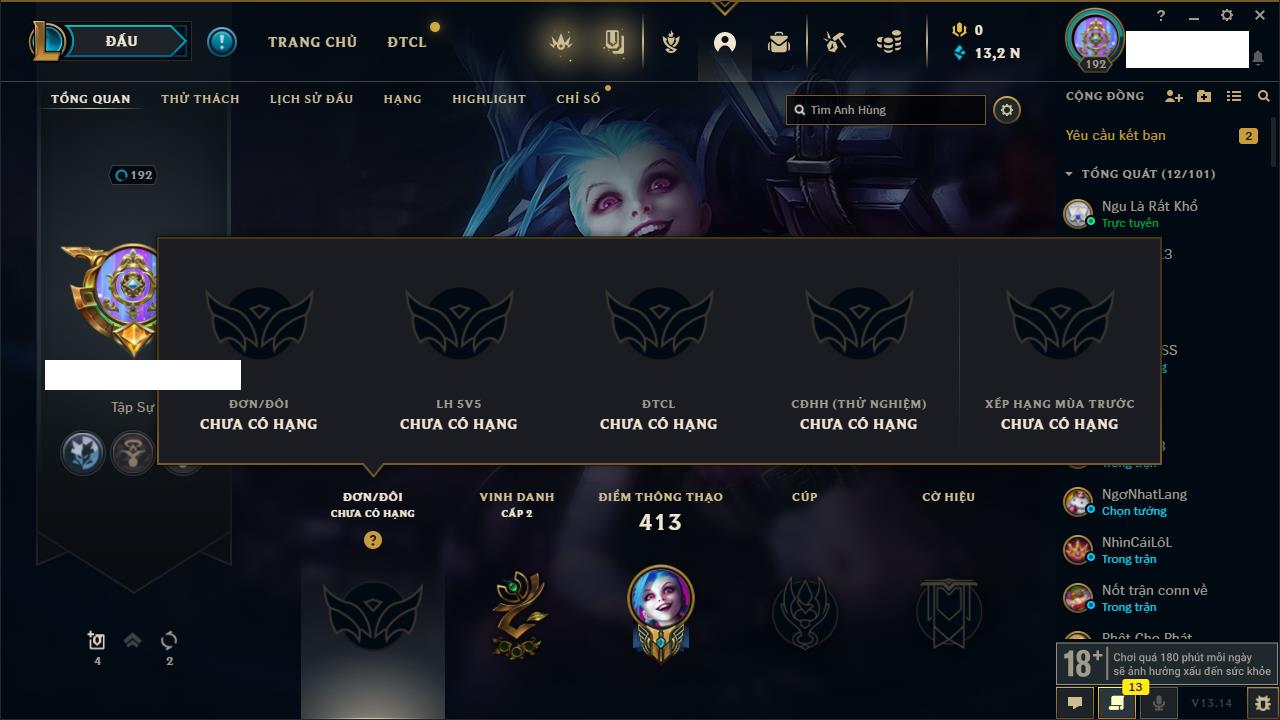 Rank Đơn: Chưa RankKhung: BạcTướng: 141 - Còn 299 THXTrang Phục: 101Rank ĐTCL: Chưa RankLinh Thú: 84