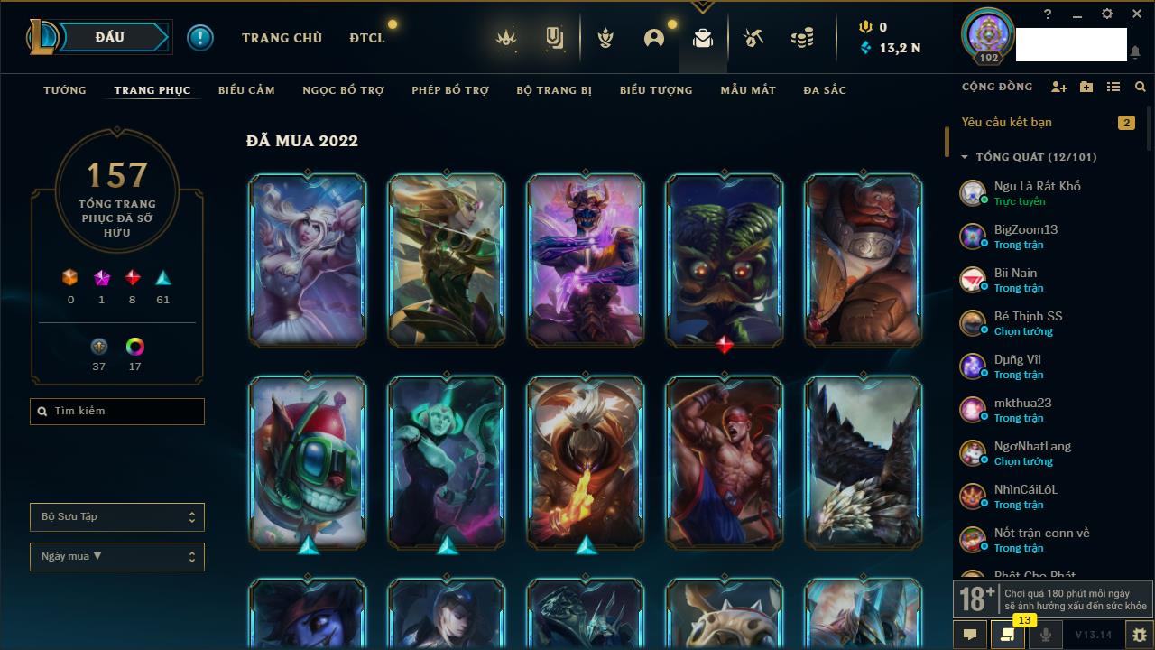 Rank Đơn: Chưa RankKhung: Chưa có khungTướng: 163 - Còn 157403 THXTrang Phục: 149Rank ĐTCL: Chưa RankLinh Thú: 122