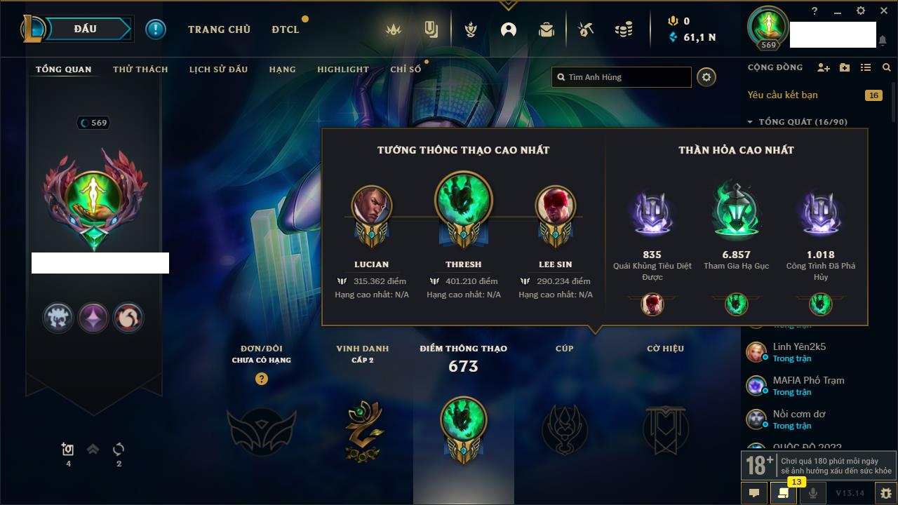 Rank Đơn: Bạc IIIKhung: Chưa có khungTướng: 171 - Còn 21493 THXTrang Phục: 252Rank ĐTCL: Bạch Kim IVLinh Thú: 123