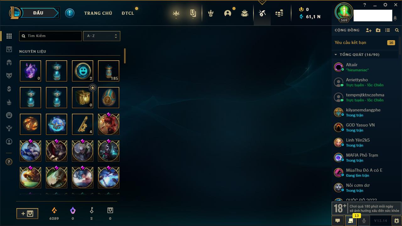 Rank Đơn: Lục Bảo IVKhung: Chưa có khungTướng: 171 - Còn 165973 THXTrang Phục: 160Rank ĐTCL: Chưa RankLinh Thú: 9