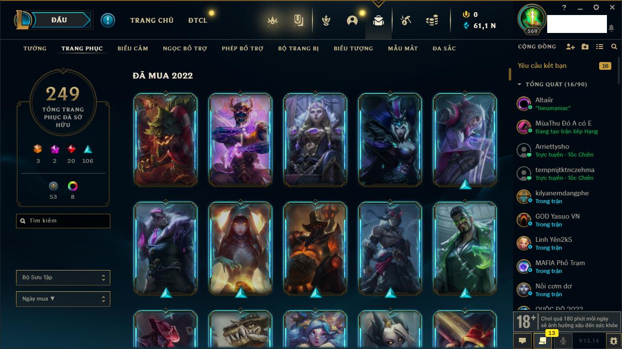 Rank Đơn: Vàng IIIKhung: VàngTướng: 161 - Còn 162202 THXTrang Phục: 179Rank ĐTCL: Chưa RankLinh Thú: 20