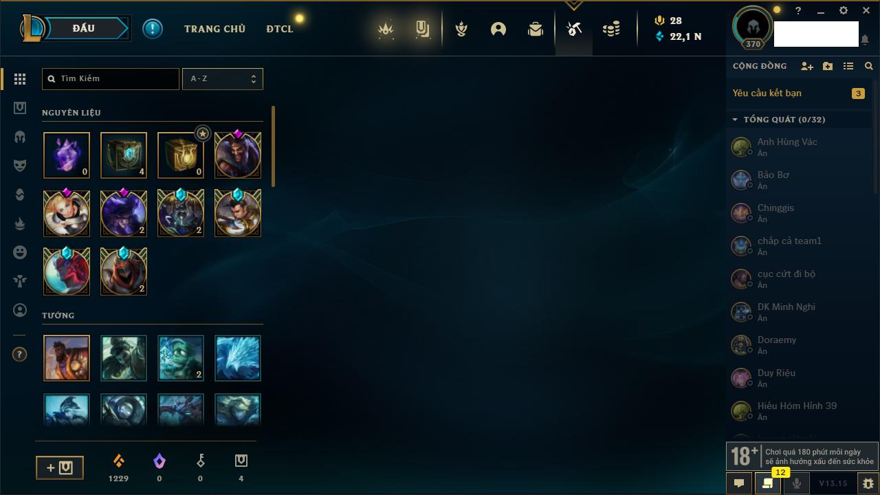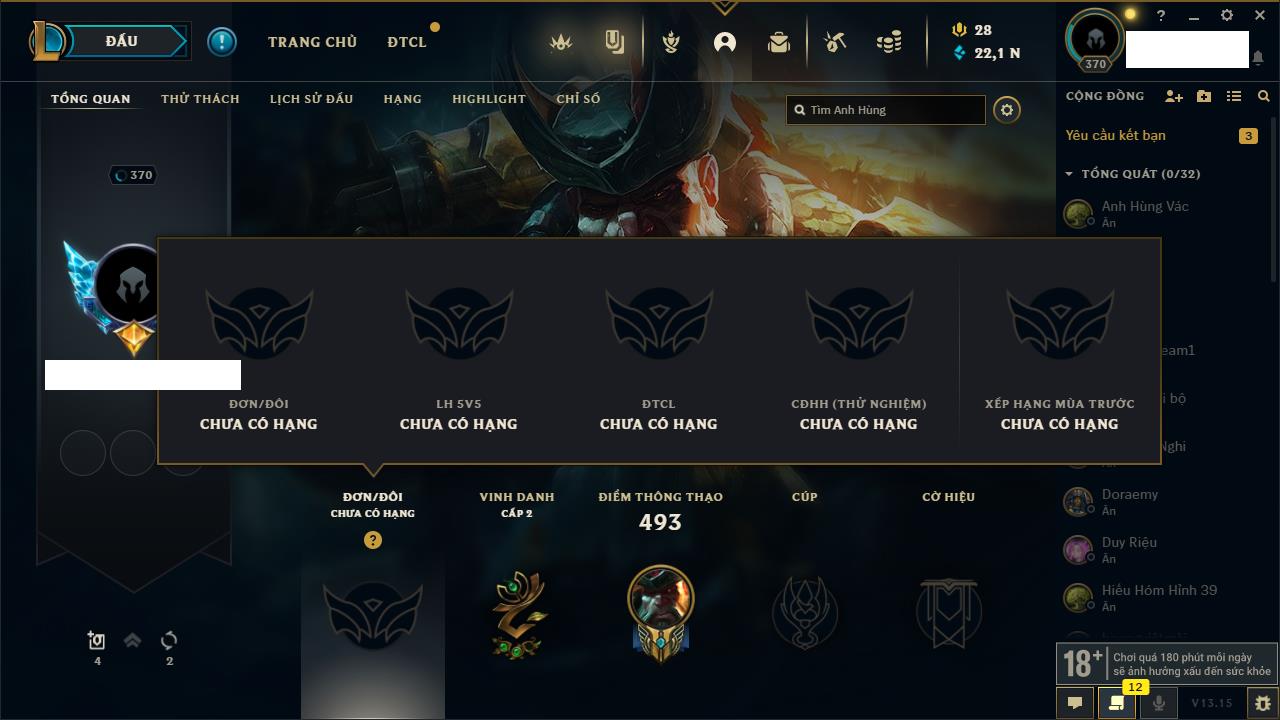 Rank Đơn: Vàng IKhung: BạcTướng: 171 - Còn 60584 THXTrang Phục: 286Rank ĐTCL: Vàng IIILinh Thú: 117
