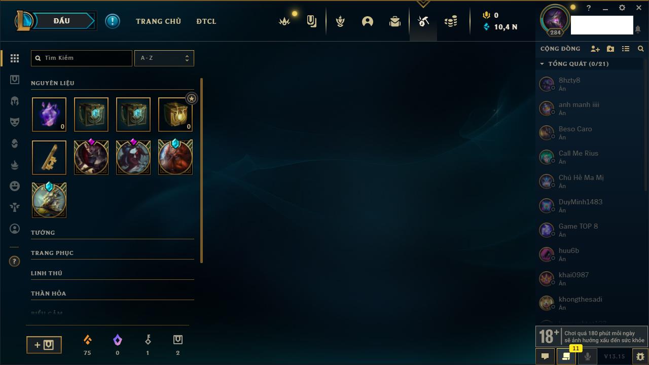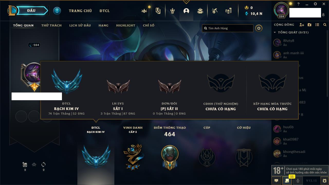 Rank Đơn: Bạc IIIKhung: VàngTướng: 171 - Còn 386278 THXTrang Phục: 170Rank ĐTCL: Chưa RankLinh Thú: 30