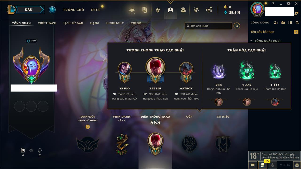 Rank Đơn: Bạc IKhung: Bạch kimTướng: 86 - Còn 1608 THXTrang Phục: 47Rank ĐTCL: Chưa RankLinh Thú: 58