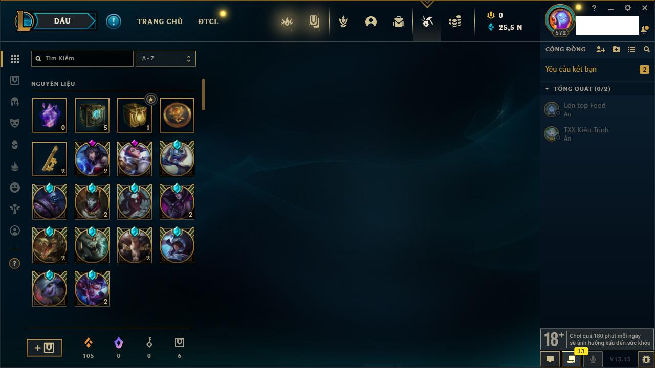 Rank Đơn: Vàng IVKhung: VàngTướng: 171 - Còn 135001 THXTrang Phục: 195Rank ĐTCL: Bạch Kim IVLinh Thú: 147