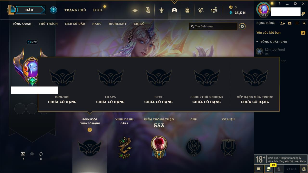 Rank Đơn: Đồng IVKhung: Chưa có khungTướng: 162 - Còn 32315 THXTrang Phục: 275Rank ĐTCL: Chưa RankLinh Thú: 33