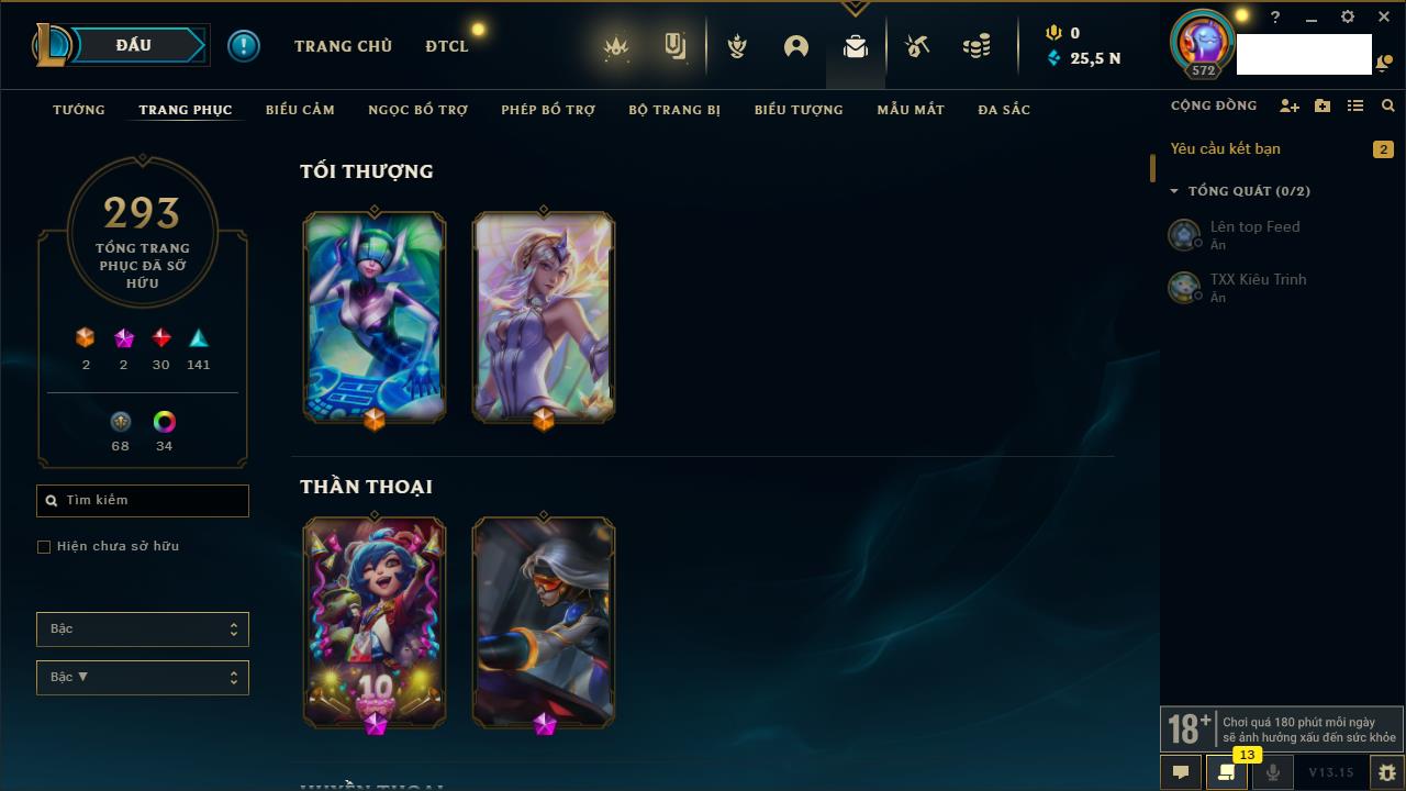 Rank Đơn: Bạc IIIKhung: BạcTướng: 170 - Còn 76760 THXTrang Phục: 235Rank ĐTCL: Chưa RankLinh Thú: 183