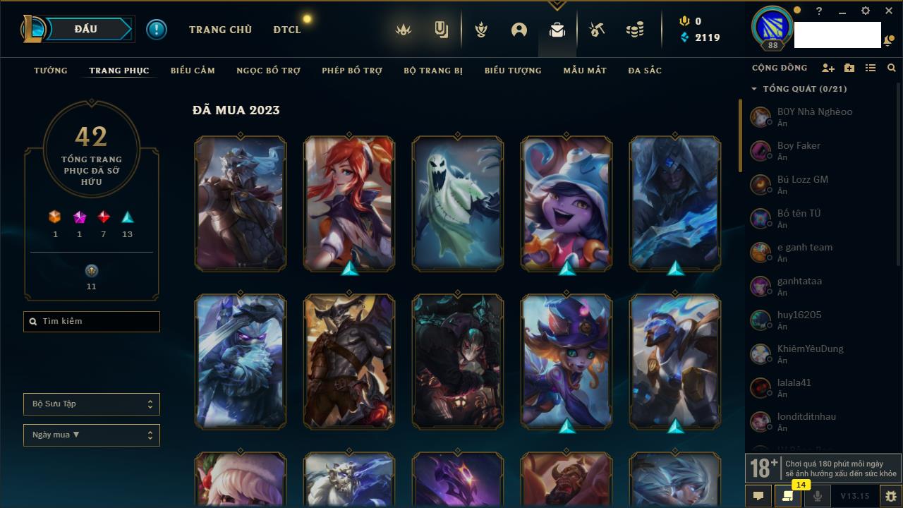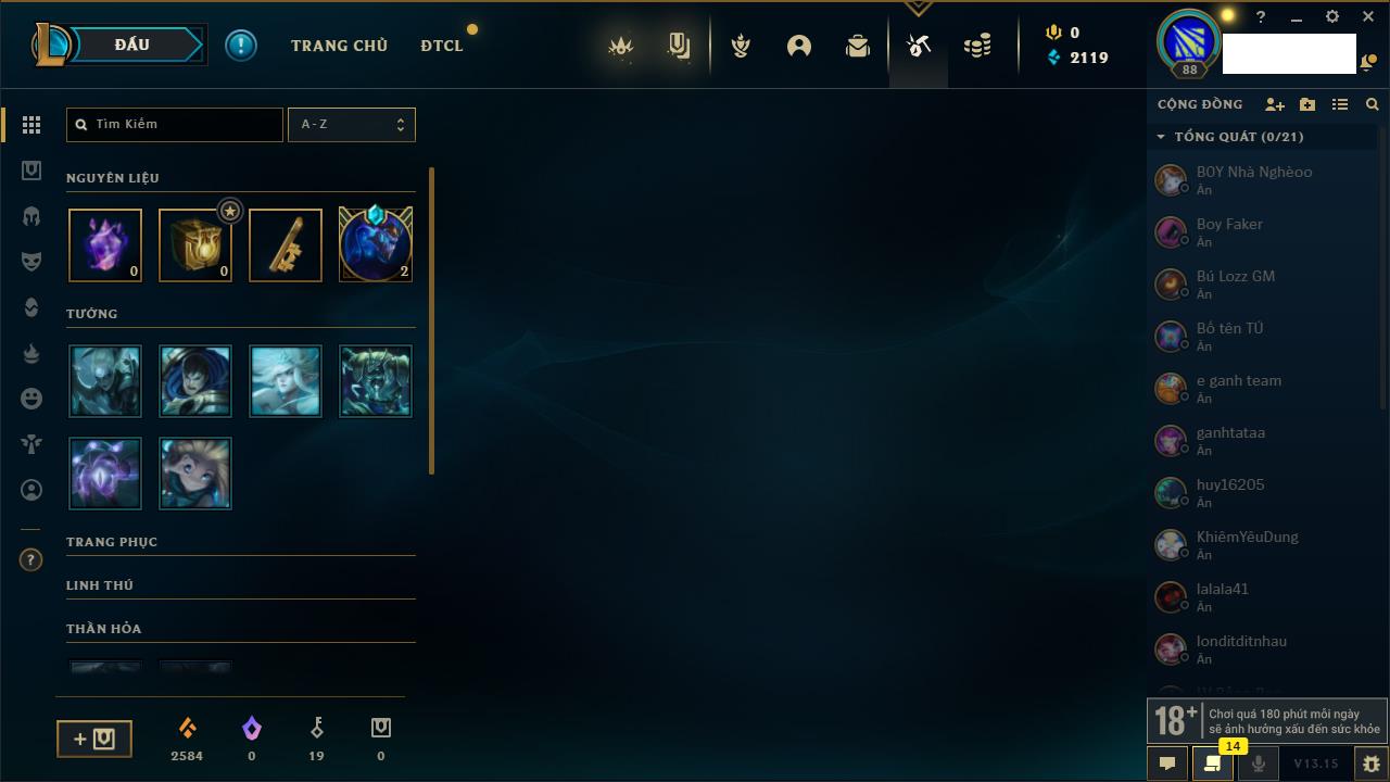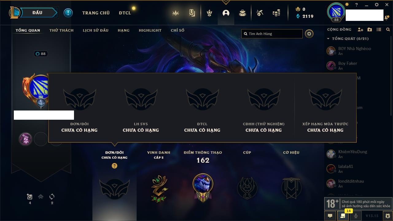 Rank Đơn: Chưa rank mùa nàoKhung: Chưa có khungTướng: 2 - Còn 9000 THXTrang Phục: 0Rank ĐTCL: Bạch Kim IIILinh Thú: 31
