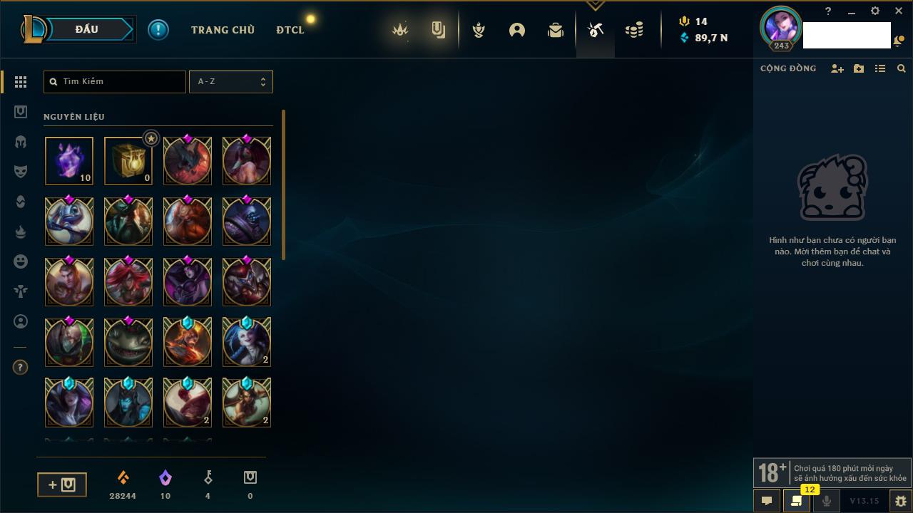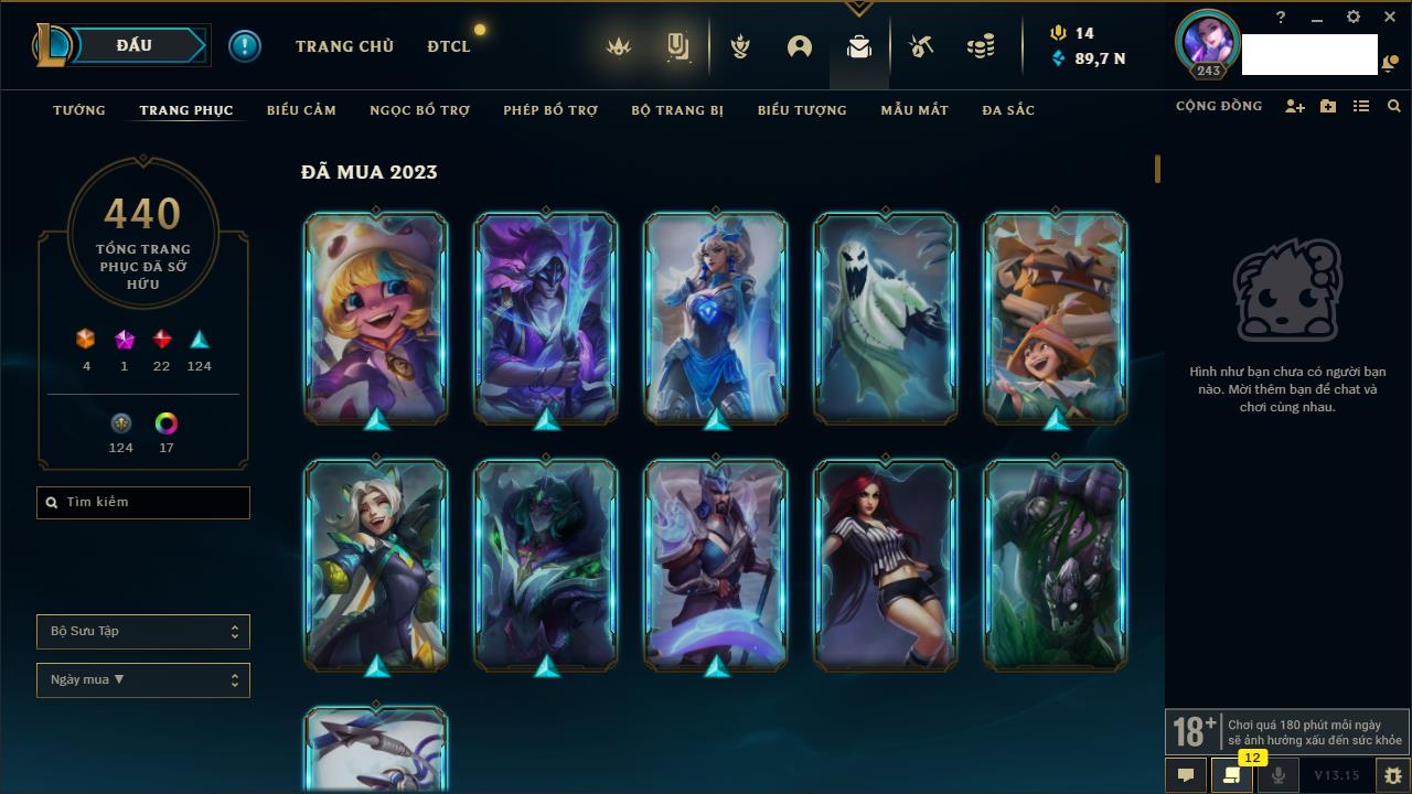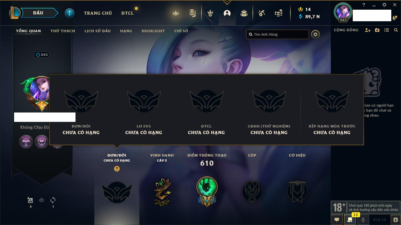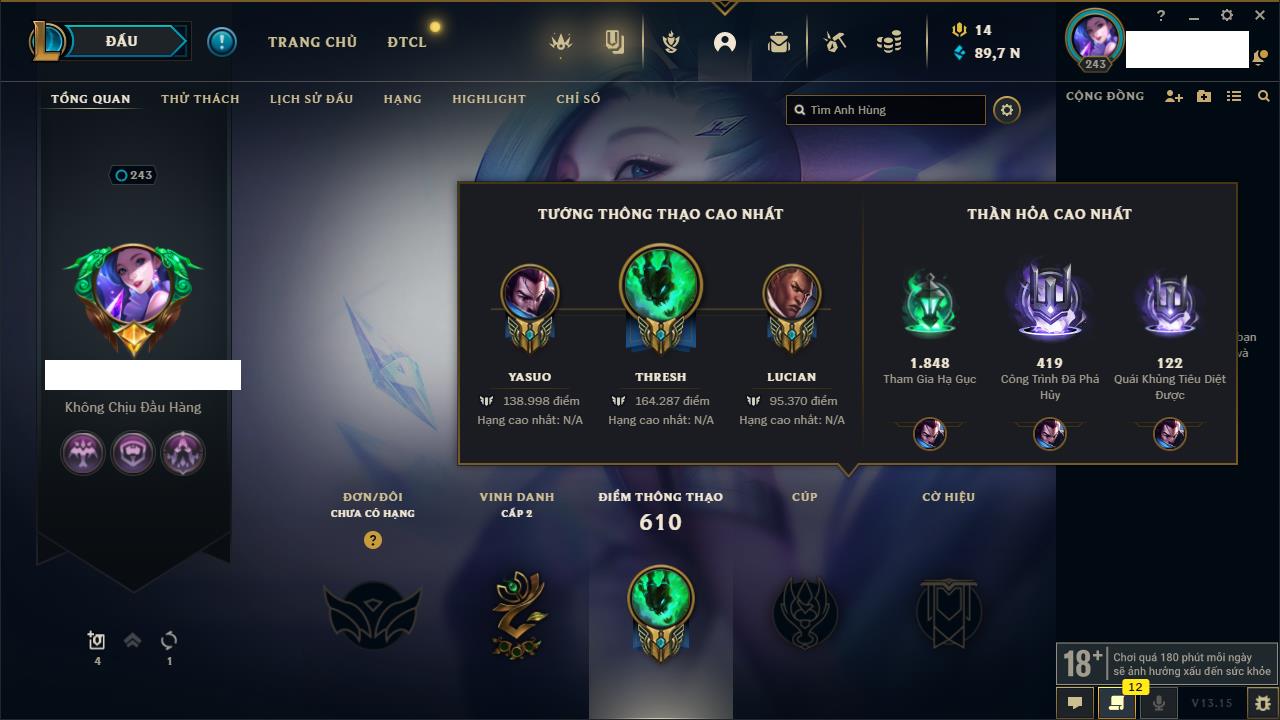 Rank Đơn: Vàng IKhung: Bạch kimTướng: 170 - Còn 212450 THXTrang Phục: 214Rank ĐTCL: Bạch Kim IVLinh Thú: 221