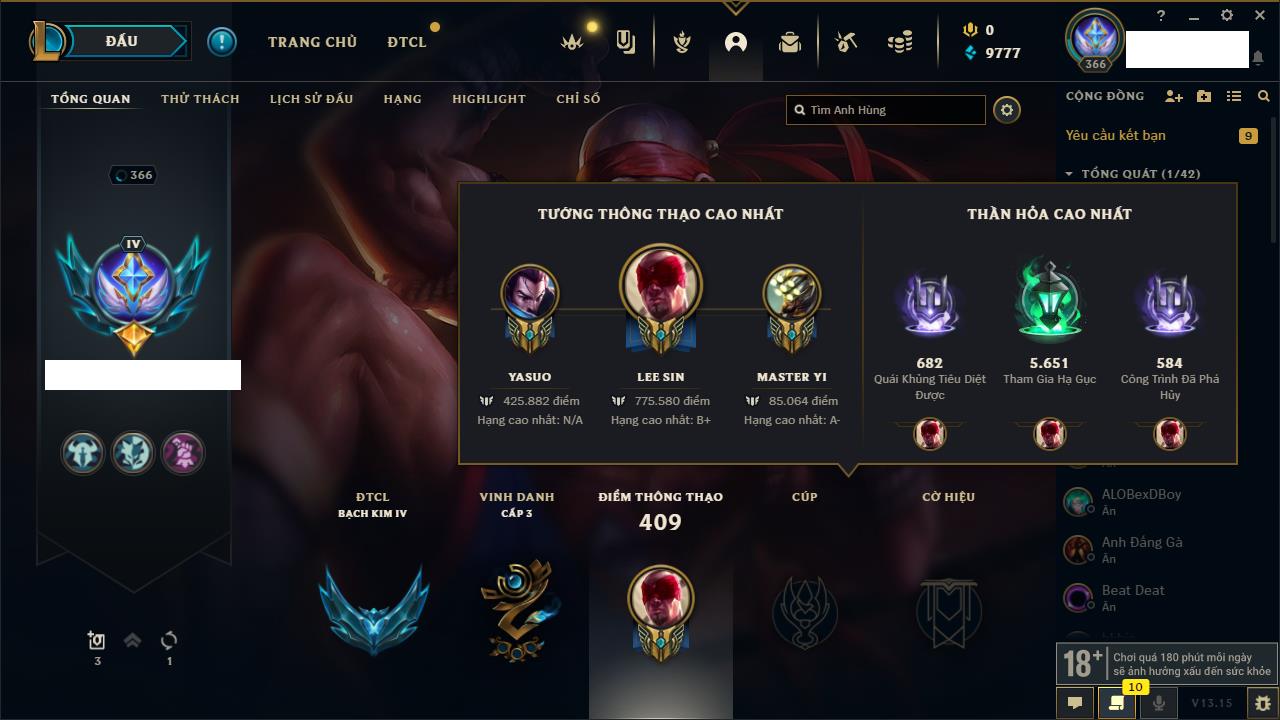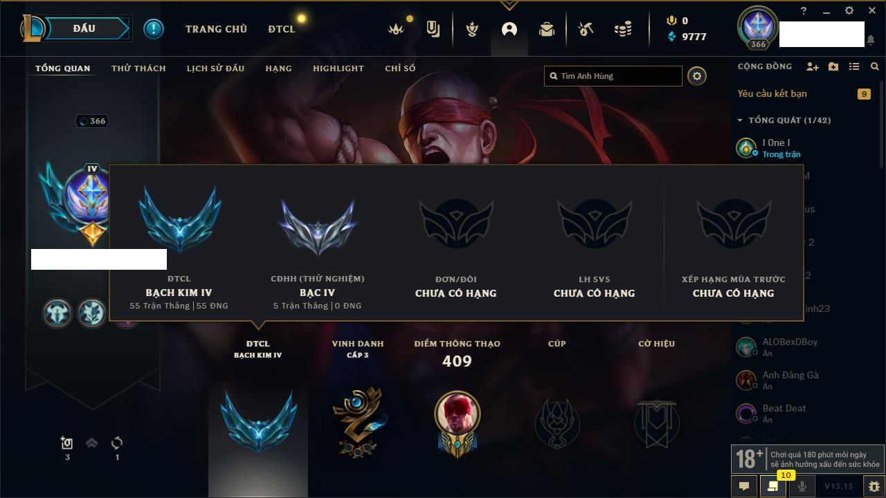 Rank Đơn: Bạch Kim IVKhung: Bạch kimTướng: 151 - Còn 16486 THXTrang Phục: 62Rank ĐTCL: Chưa RankLinh Thú: 12